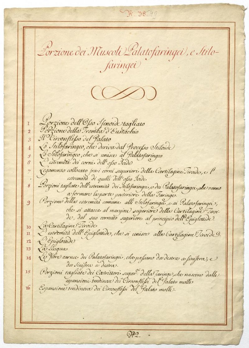 Der Text ist die ergänzende Beschreibung in italienischer Sprache zum anatomischen Wachsmodell der Gaumen- und Schlundmuskeln.