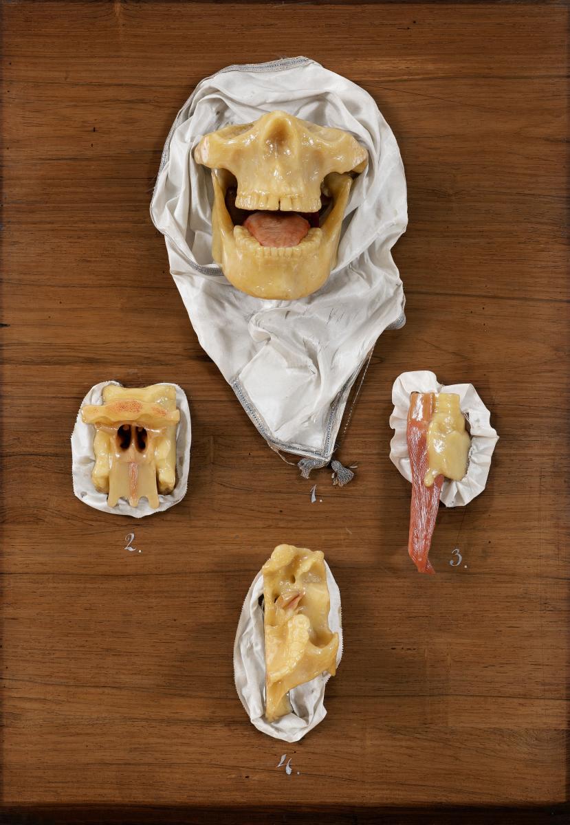 1. Isoliertes Modell der Knochen der unteren Gesichtshälfte, durch den geöffneten Mund mit Zunge kann man die Muskeln des vorderen und des hinteren Gaumenbogens (Musculus palatoglossus und Musculus palatopharyngeus) erkennen. 2. Isoliertes Modell des Bereiches der inneren Nasenöffnungen (Choanen) der Schädelbasis von dorsal. Links und rechts der durch die Nasenscheidenwand getrennten Choanen sieht man die Einmündung der Ohrtrompete (Tuba auditiva). Nach unten hin ist hell herabhängend der weiche Gaumen dargestellt, in der Mitte sieht man den Muskel des Zäpfchens (Musculus uvulae). 3. Isoliertes Modell von Rachen und Kehlkopf. Das Modell steht auf dem Kopf, sodass sich oben Luftröhre und Speiseröhre und unten die Rachenmuskulatur dargestellt ist. 4. Isoliertes Modell der rechten Oberkieferseite mit dem weiterführenden Anteil der Schädelbasis. Direkt vor der ebenfalls dargstellten Ohrtrompete (Tuba auditiva) ist der Musculus tensor veli palatini dargestellt.