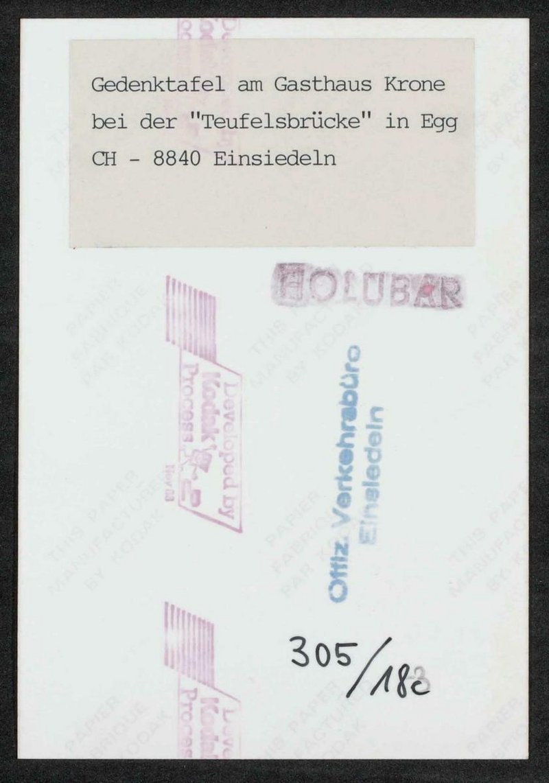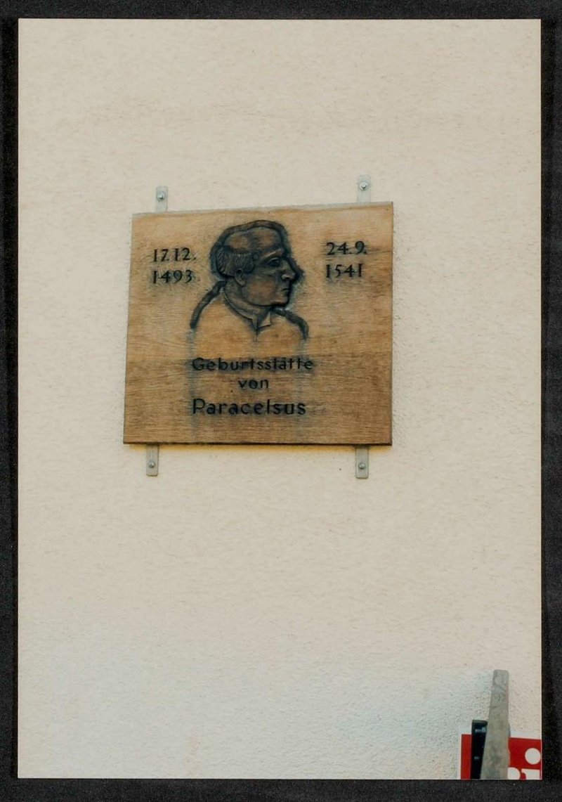 Das Geburtshaus von Paracelsus wurde 1758 abgerissen. Am dann neu errichteten Gebäude, das das Restaurant Zur Krone beherbergte, wurde später eine Gedenktafel zu Ehren von Paracelsus angebracht. Auf der Bildhinterseite befindet sich ein Stempel von Karl Holubar. Neg. (9x12) 1.651