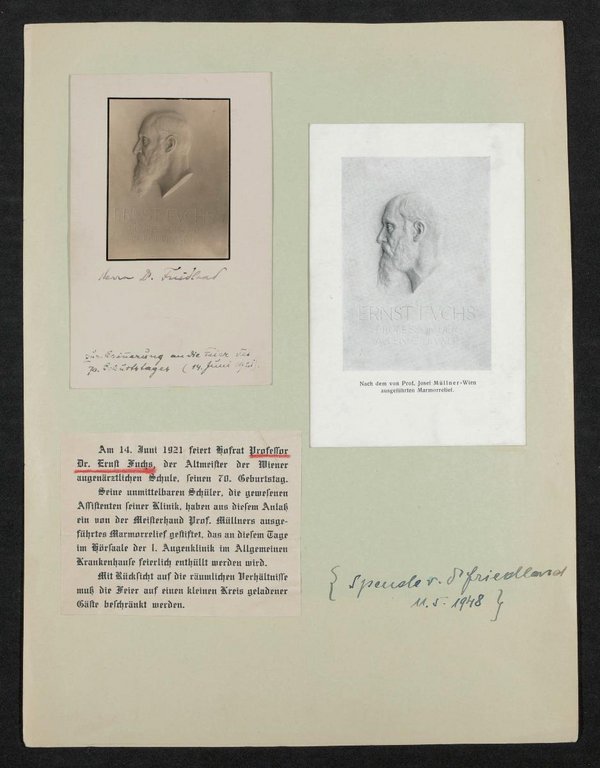 Die Gedenktafel bzw. das Mamorrelief wurden anlässlich des 70. Geburtstages des Dargestellten von Josef Müllner, Wien 1921, angefertigt. Sie befanden sich bis 1951 im Hörsaal der I. Universitäts-Augenklinik. Auf einer Postkarte ist ein Vermerk einer Spende von Dr. Friedland 11. Mai 1948 zu sehen.