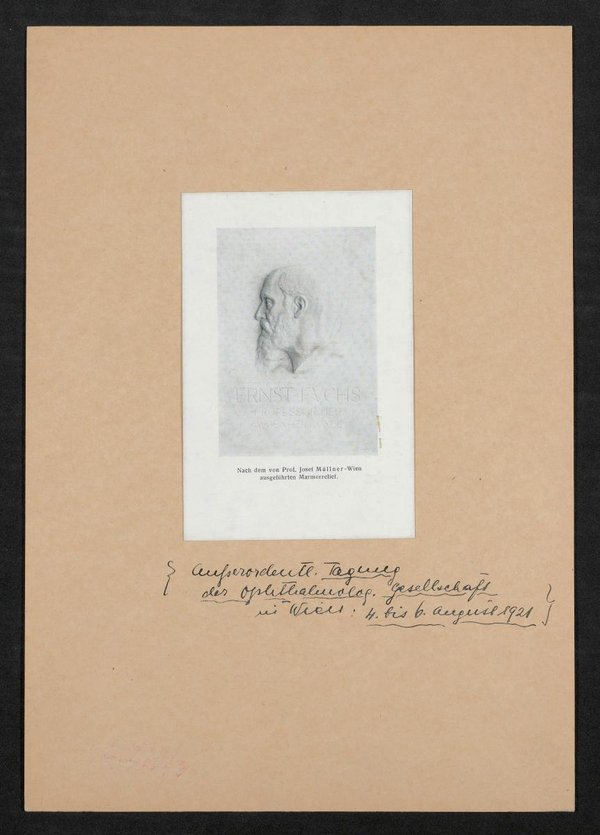 Die Gedenktafel bzw. das Mamorrelief wurden anlässlich des 70. Geburtstages des Dargestellten von Josef Müllner, Wien 1921, angefertigt. Sie befanden sich bis 1951 im Hörsaal der I. Universitäts-Augenklinik.