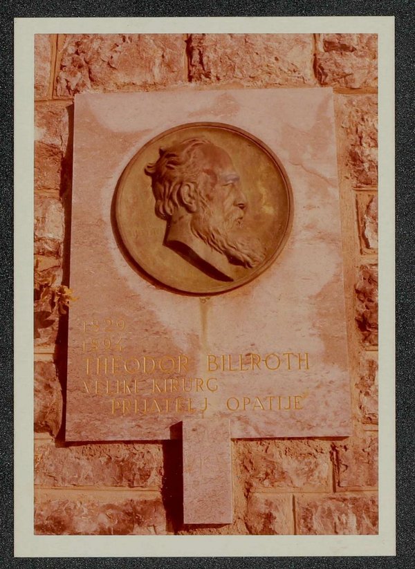 Die Fotografie wurde vermutlich von Foto Park, Optija, angefertigt. Das der Tafel zugehörige Relief wurde 1965 von Louis Dolinar angefertigt. Bis zum Zweiten Weltkrieg hatte es in Opatija bereits einen Gedenkstein für Billroth gegeben. Neg I 237/16, 17 Neg III 42/1