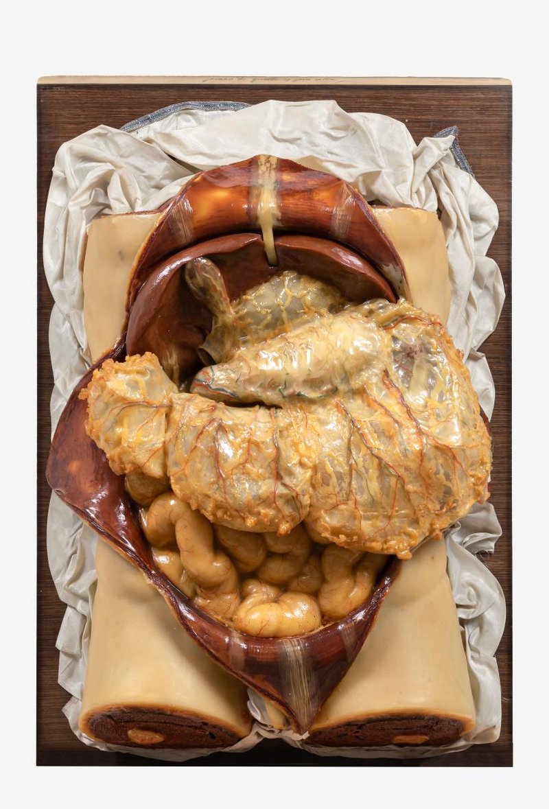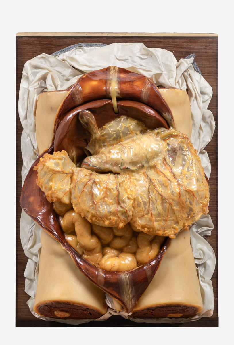 Eröffneter Bauchraum, die Leber ist nach oben geklappt. Das große Netz (Omentum majus) mit seiner Befestigung an der großen Magenkurvatur und das kleine Netz (Omentum minus) zwischen kleiner Magenkurvatur und Leber mit dem Zugang zum Foramen epiploicum [Winslowi] (künstlich aufgebläht).