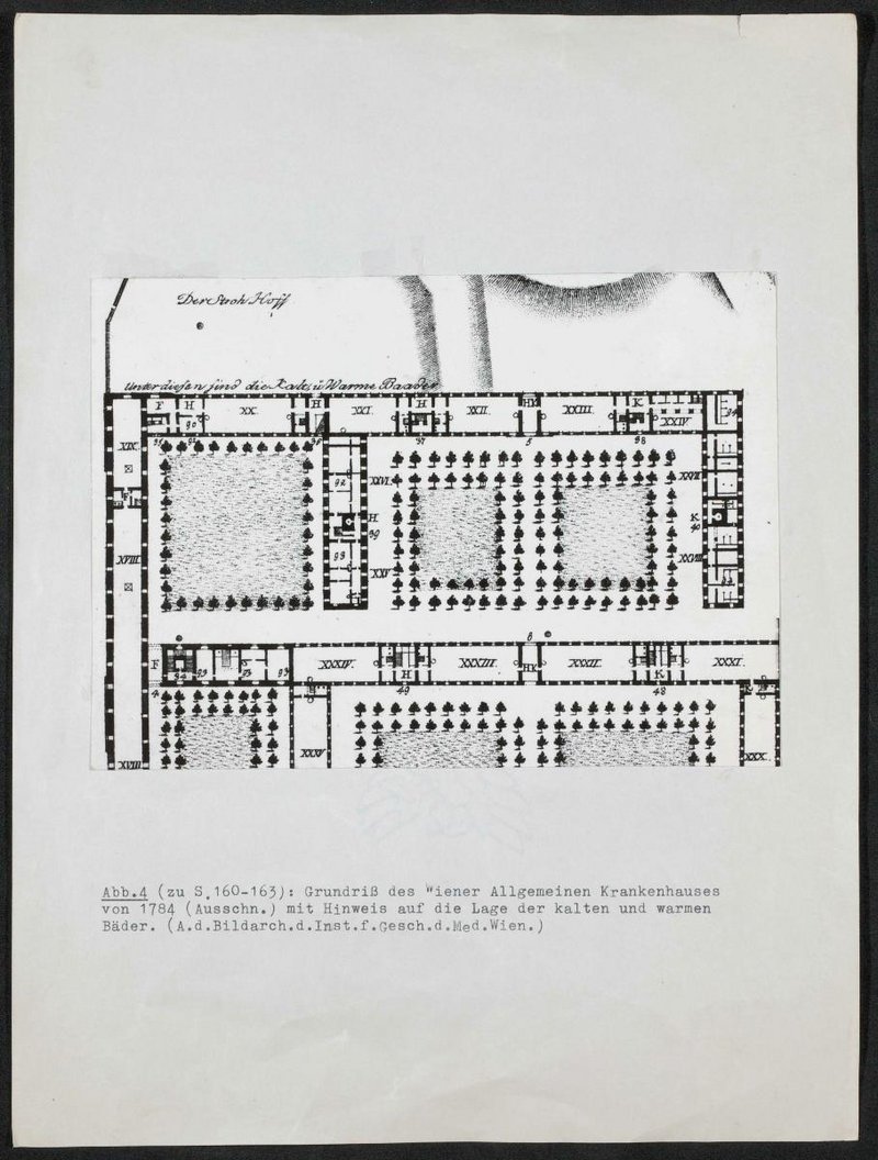 Der Auszug ist dem Grundriss des k.k. Allgemeinen Krankenhauses und des Narrenturms entnommen. Er wurde für eine nicht spezifizierbare Ausstellung, vermutlich im Josephinum, verwendet.