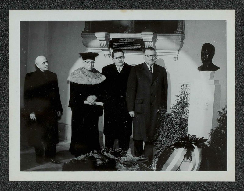 Von links nach rechts sind abgebildet: vermutlich Alfred Winterstein, Hans Hoff, unbekannte Person, vermutlich Prof. Bartmeier. Fotograf:in unbekannt.