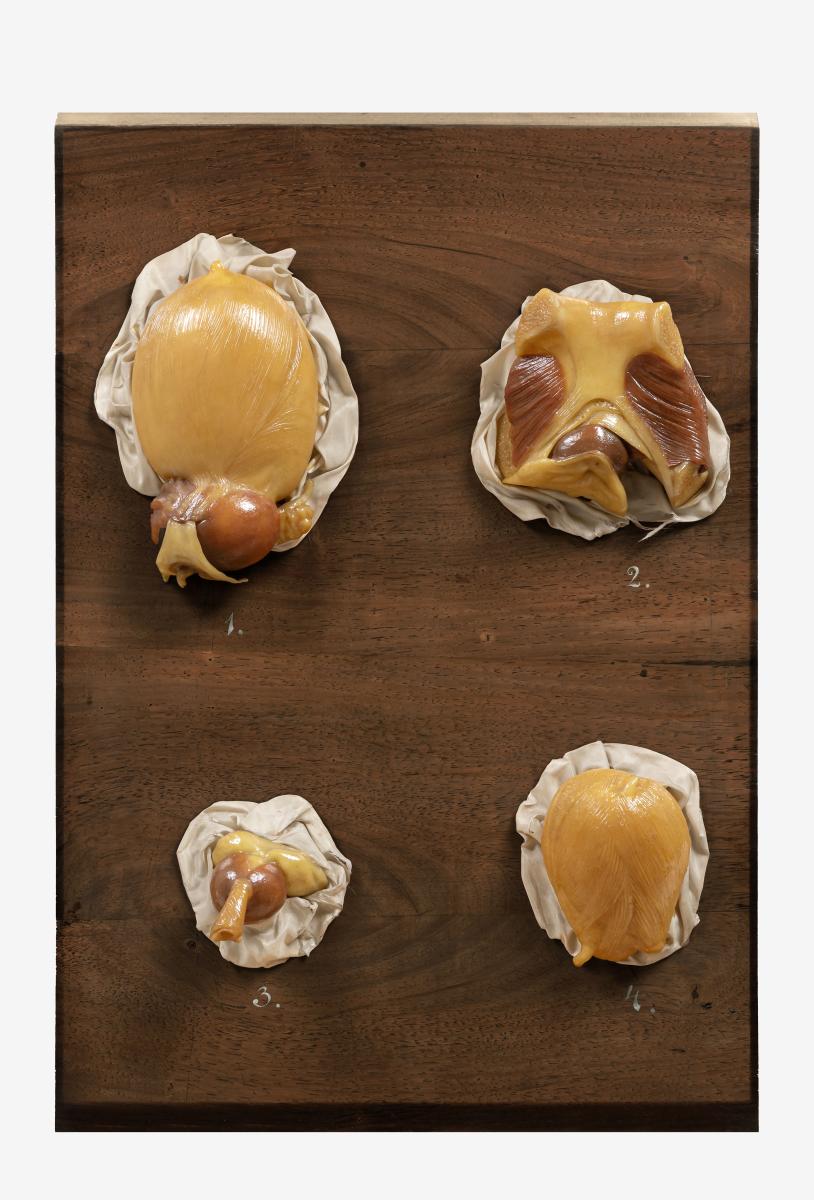 1. Die Muskulatur der Harnblase (Tunica muscularis), die Vorsteherdrüse (Prostata), ein Samenbläschen (Vesicula seminalis), der Samenleiter (Ductus deferens), die abgeschnittene Harnröhre (Urethra), das durchtrennte Ligamentum umbilicale medianum (ehemaliger Urachus / Urharngang), der Harnleiter (Ureter), das Ligamentum puboprostaticum und der Musculus pubovesicalis). 2. Zentrale Anteile der Schambeine (Ossa pubis) und die Schambeinfuge sowie die das Foramen obturatum bedeckenden Muskeln von innen. Die Vorsteherdrüse (Prostata), ein Teil der Harnblase (Vesica urinaria) und die innere Harnröhrenöffnung (Orificium urethrae internum). 3. Die Vorsteherdrüse (Prostata) und ihre Beziehungen zum Blasengrund (Fundus vesicae) und zum Anfangsteil der Harnröhre (Pars prostatica urethrae) von unten. 4. Die Muskulatur der Harnblase (Tunica muscularis vesicae).