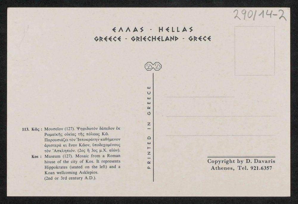 Die Vorlage der Abbildung ist ein Mosaik aus dem 2.-3. Jahrhundert n. Chr., das von Morricone 1937 in Kos gefunden wurde. Zum Zeitpunkt der Entstehung der Postkarte befand es sich im Archäologischen Museum Kos. Die Postkarte wurde von D. Davaris vertrieben.
