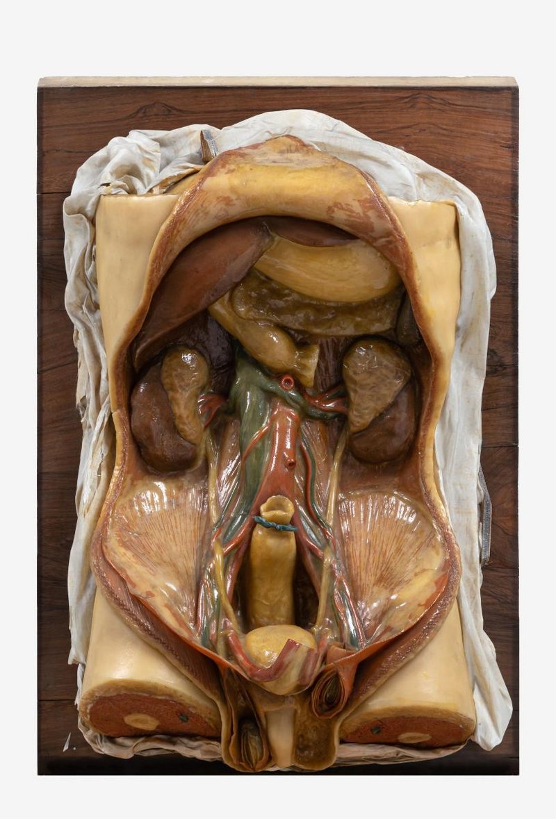 1. Der Stand des Hodens (Testis) bei einem acht Monate alten Fötus. Der eine Hoden ist schon im Hodensack (Scrotum), der andere auf der Höhe des Leistenrings (Anulus inguinalis profundus), vergrößert.