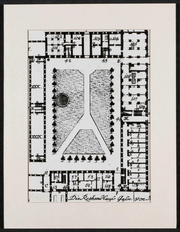 Der Auszug ist dem Grundriss des k.k. Allgemeinen Krankenhauses und des Narrenturms entnommen. Er wurde für eine nicht spezifizierbare Ausstellung verwendet.