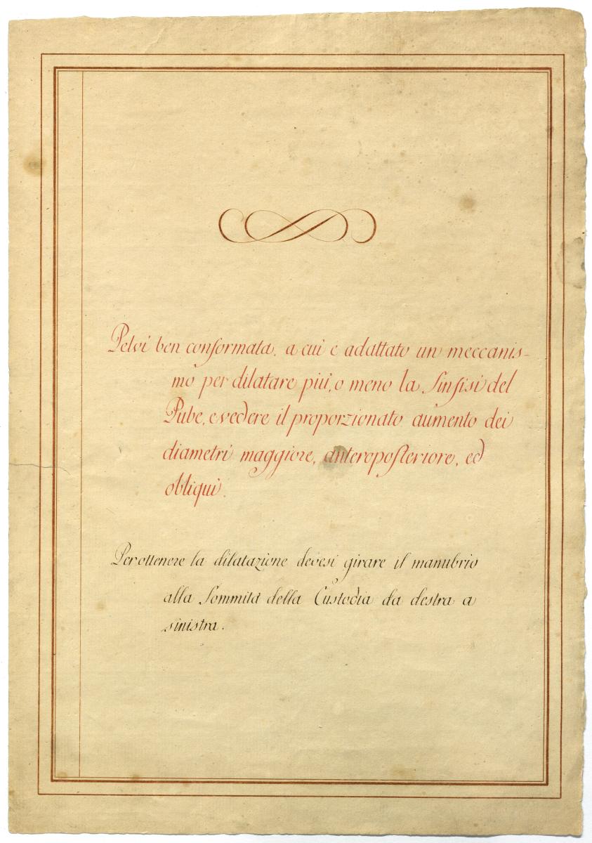 Der Text ist die ergänzende Beschreibung in italienischer Sprache zum anatomischen Wachsmodell eines weiblichen Beckens.