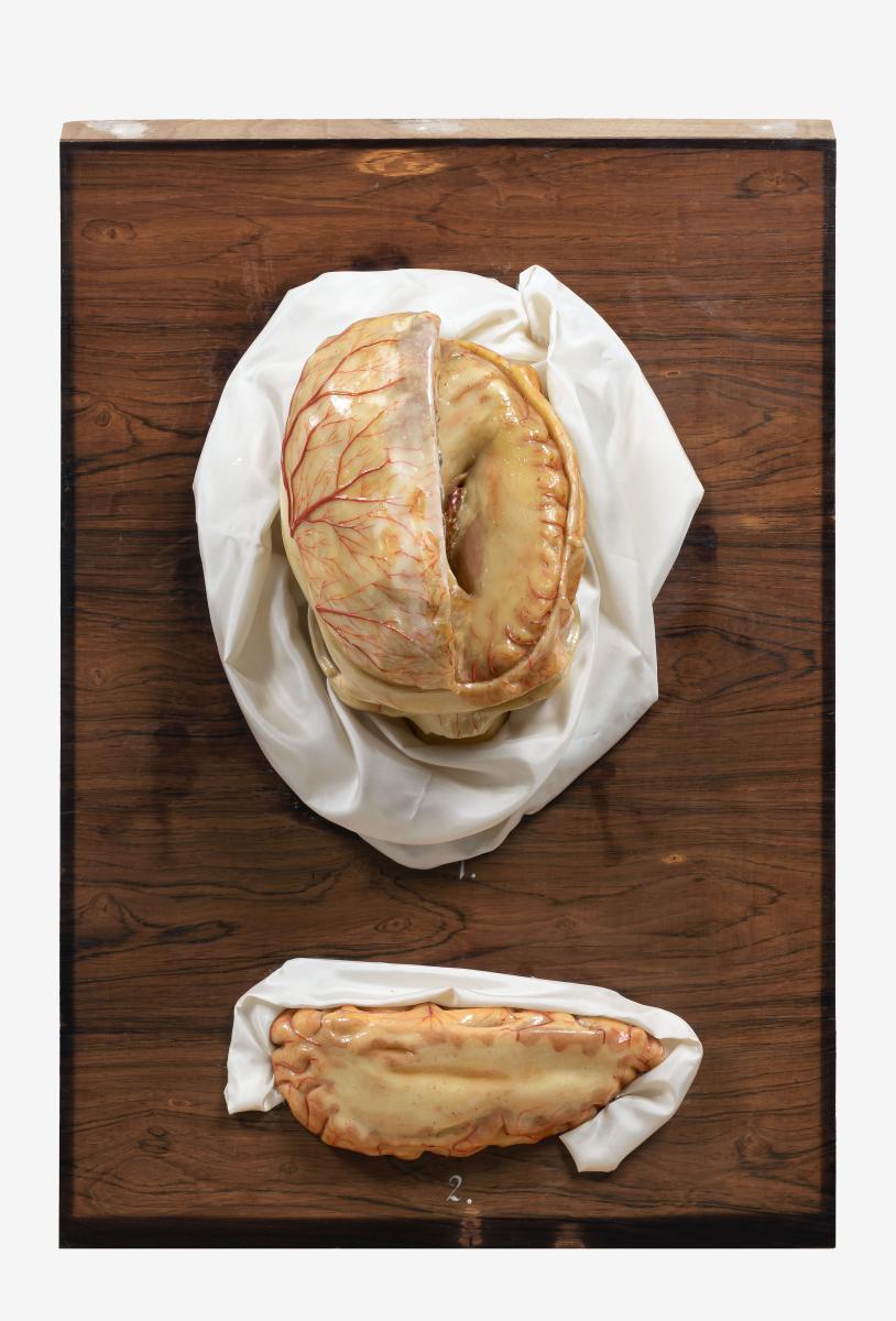 1. Die linke Großhirnhälfte eines im Schädel belassenen Gehirns ist durch einen Horizontalschnitt bis auf den Balken (Corpus callosum) abgetragen worden, so daß der linke Seitenventrikel (Ventriculus lateralis sinister) freiliegt; die Hirnhäute sind zurückgeschlagen. 2. Korrespondierender Horizontalschnitt durch eine Großhirnhemisphäre mit Hirnrinde (Cortex cerebri) und weißer Substanz (Centrum semiovale).