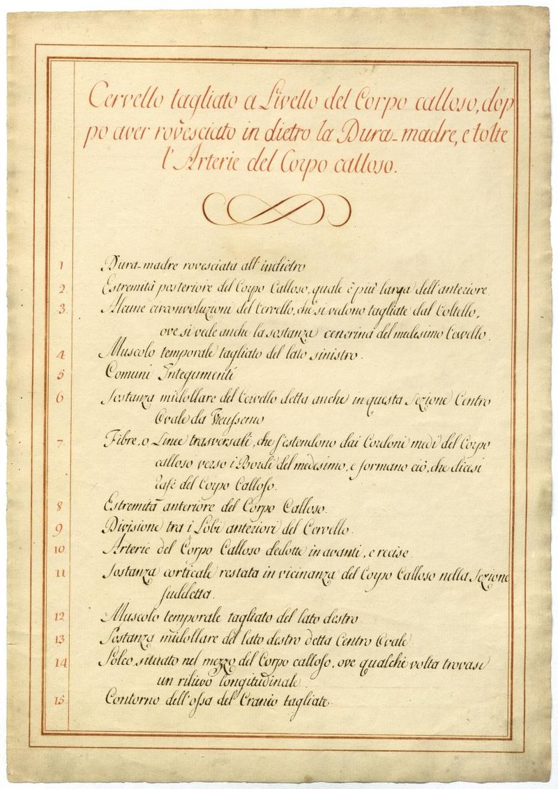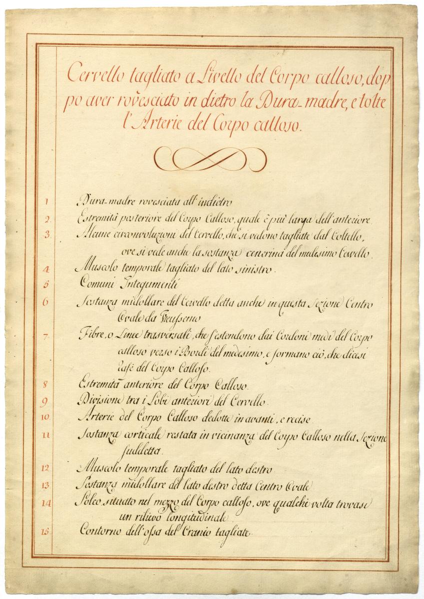 Der Text ist die ergänzende Beschreibung in italienischer Sprache zum anatomischen Wachsmodell des Gehirns.