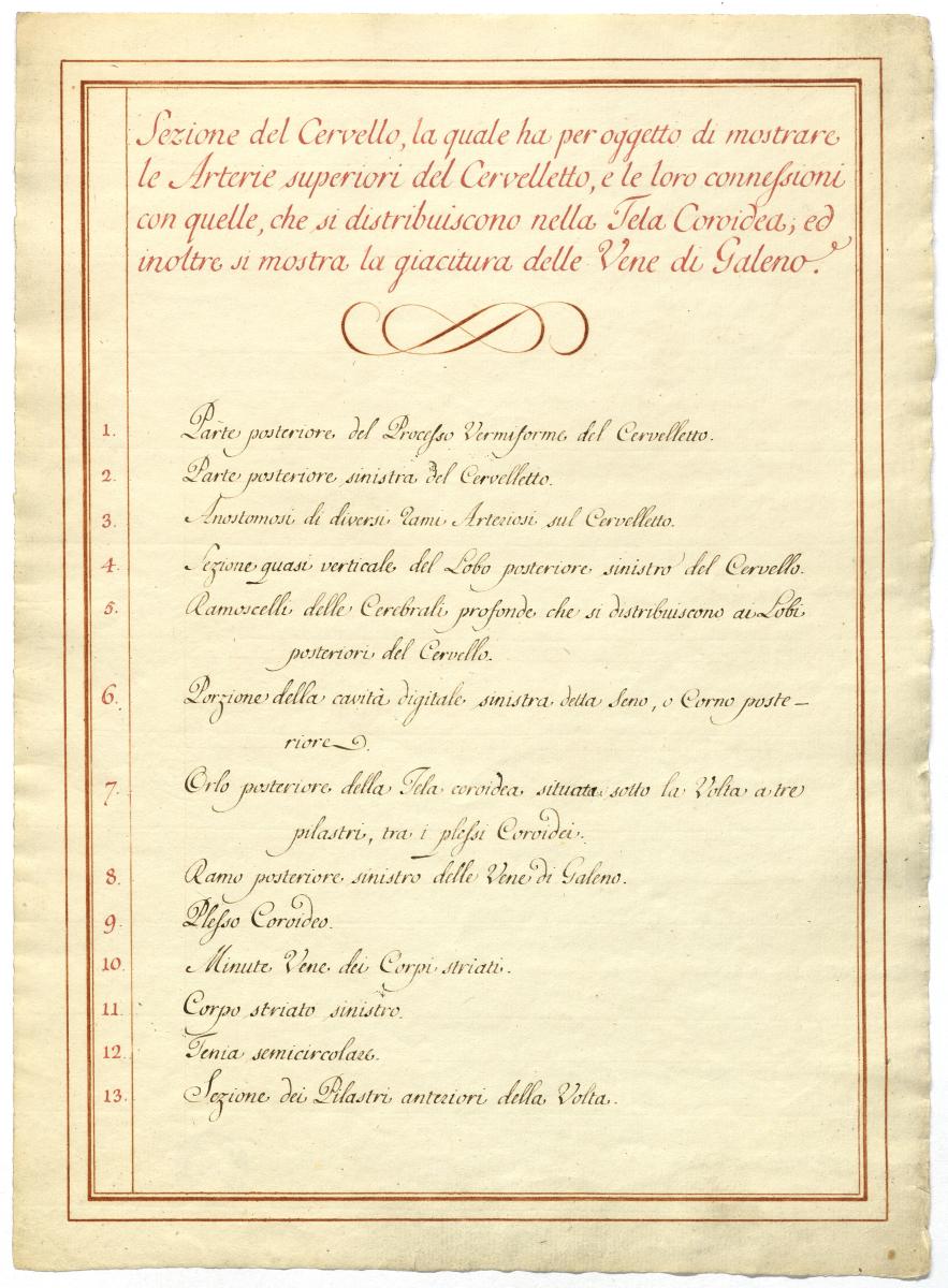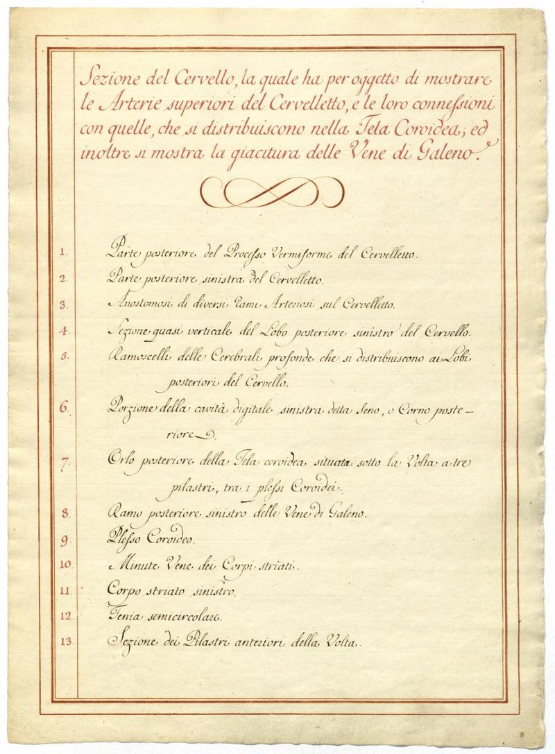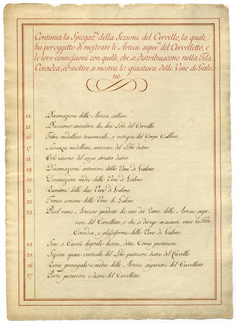 Der Text ist die ergänzende Beschreibung in italienischer Sprache zum anatomischen Wachsmodell des Gehirns.
