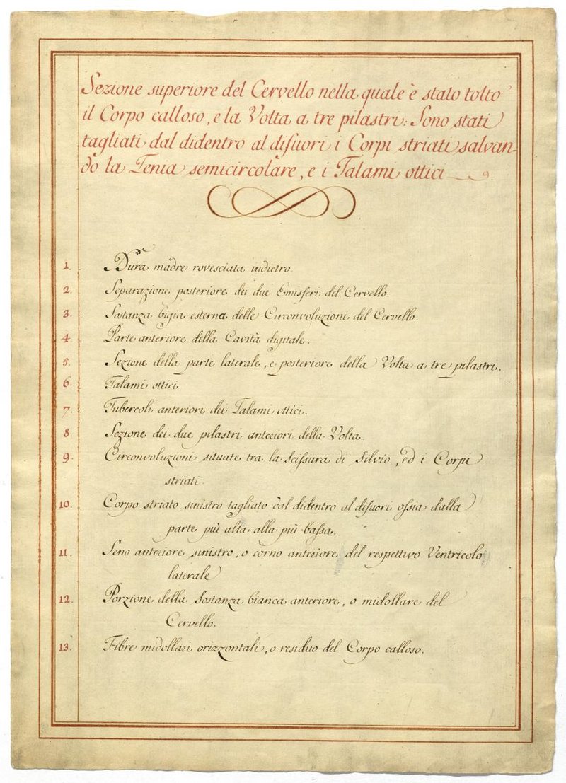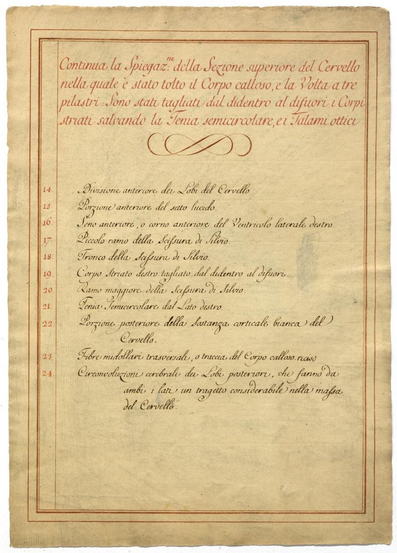 Der Text ist die ergänzende Beschreibung in italiensicher Sprache zum anatomischen Wachsmodell des Gehirns.