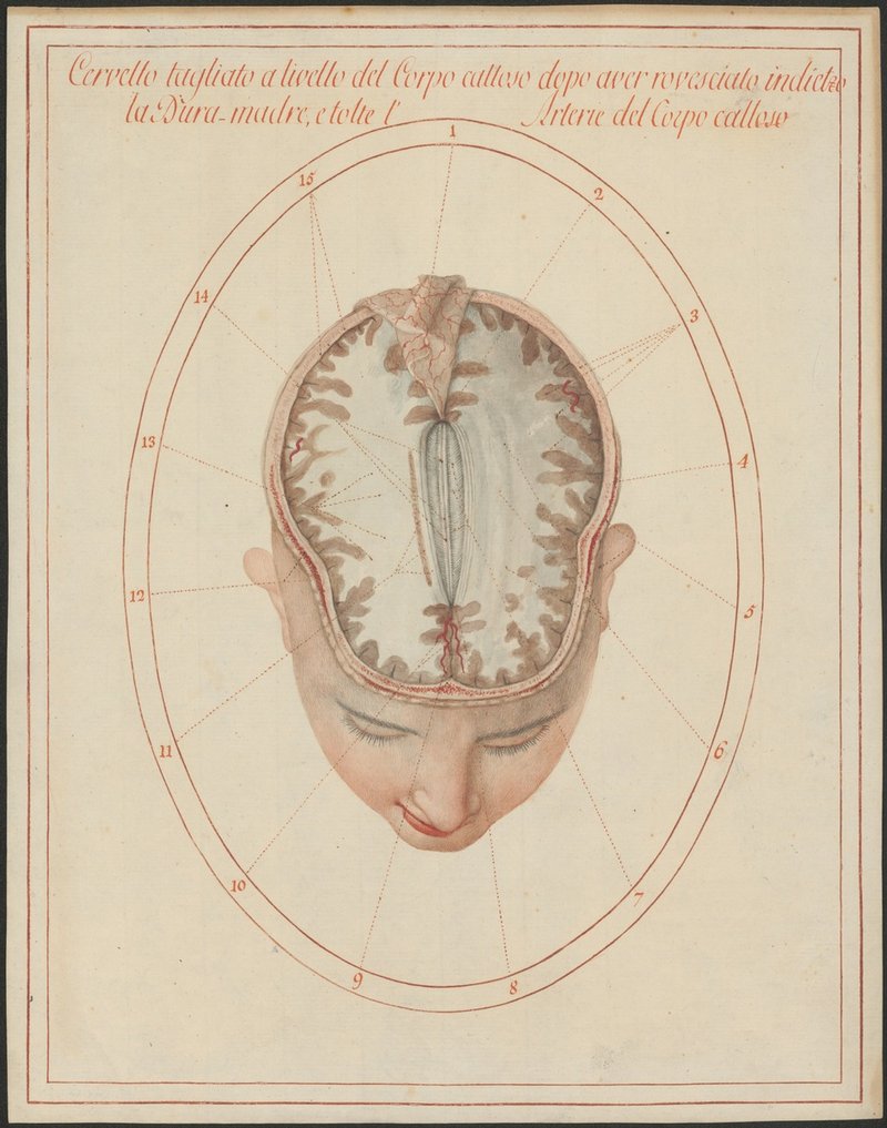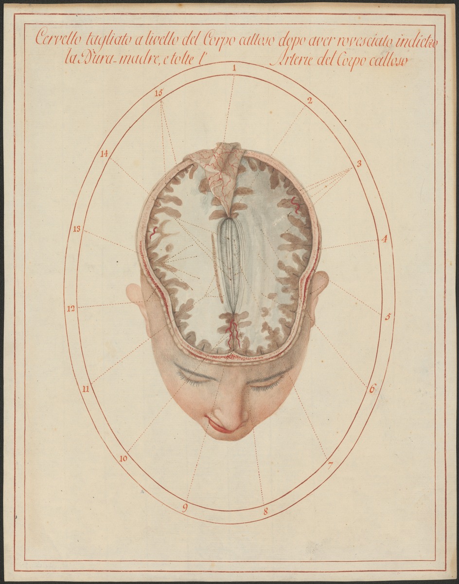 Horizontalschnitt durch das im Schädel belassene Gehirn mit der Oberseite des Balkens (Corpus callosum). Die Großhirnsichel (Falx cerebri) ist zurückgeschlagen.