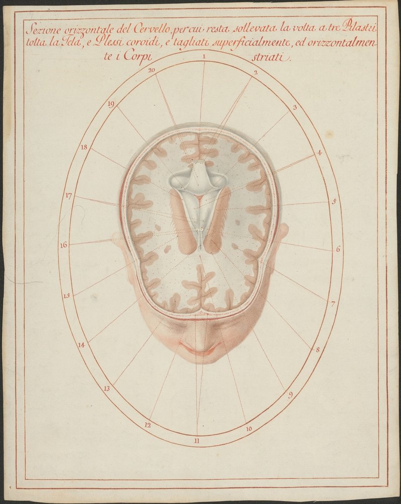Horizontalschnitt durch das im Schädel belassene Großhirn zur Darstellung von Nucleus caudatus und Thalamus.