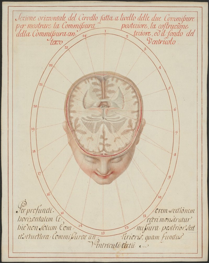 Horizontalschnitt durch das im Schädel belassene Gehirn, etwas tiefer als der vorherige geführt, mit dem Thalamus und dem Boden des dritten Ventrikels (Ventriculus tertius).