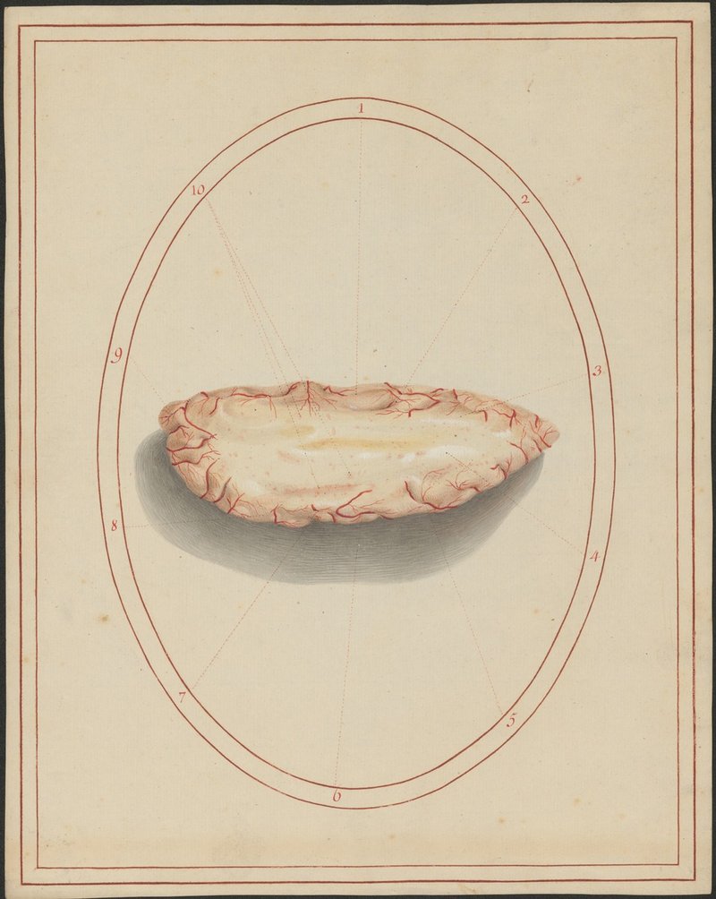 Korrespondierender Horizontalschnitt durch eine Großhirnhemisphäre mit Hirnrinde (Cortex cerebri) und weißer Substanz (Centrum semiovale).