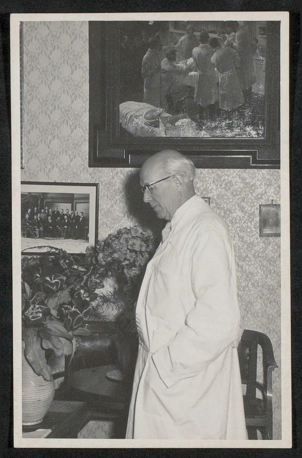 Das Bild an der Wand rechts oben zeigt Theodor Billroth bei einer Operation; links unten ein Gruppenbild, das Theodor Billroth mit Student:innen zeigt.