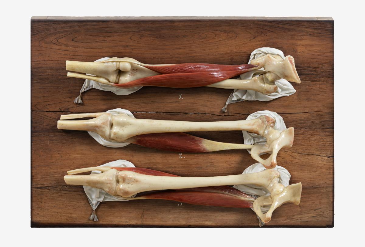 1. Beckenknochen (Beckenschaufel entfernt), Oberschenkelknochen und proximale Tibia sowie Fibula der rechten unteren Extremität von hinten: Musculus semitendinosus und Musculus biceps femoris. 2. Beckenknochen (Beckenschaufel entfernt), Oberschenkelknochen und proximale Tibia sowie Fibula der rechten unteren Extremität von vorne: Musculus semimembranosus 3. Beckenknochen (Beckenschaufel entfernt), Oberschenkelknochen und proximale Tibia sowie Fibula der rechten unteren Extremität von vorne: Musculus semitendinosus und Musculus biceps femoris.