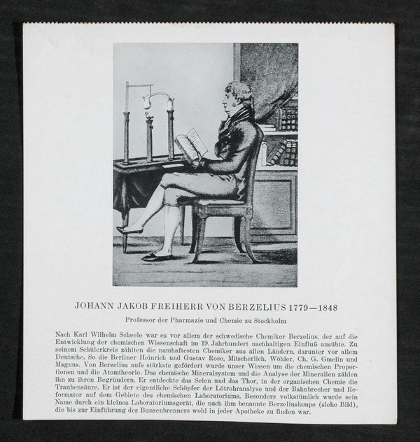 Auszug aus einem Kalender. Vorlage des Bildes war vermutlich eine Zeichnung. Der unter dem Bild abgedruckte Beitrag handelt vom Einfluss Berzelius auf die Entwicklung der chemischen Wissenschaft.