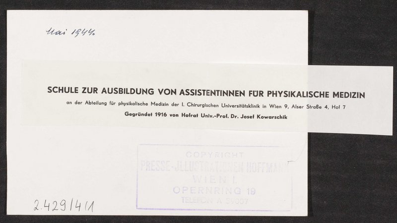 Die Fotografie wurde von Hoffmann, Presse-Illustrationen, Wien, angefertigt. Rückseitig mit dem Briefkopf der Abteilung für physikalische Medizin der I. Chirurgischen Universitätsklinik, Wien, gegründet von Josef Kowarschik, versehen.
