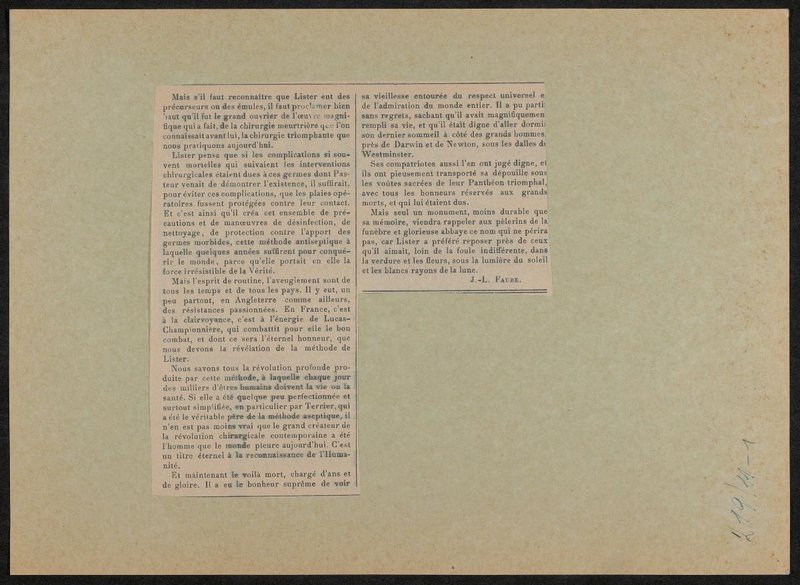 Zeitungsausschnitt aus: La Presse Medicale. Fotografie eines Gemäldes von Jean-André Rixens aus dem Jahr 1902.