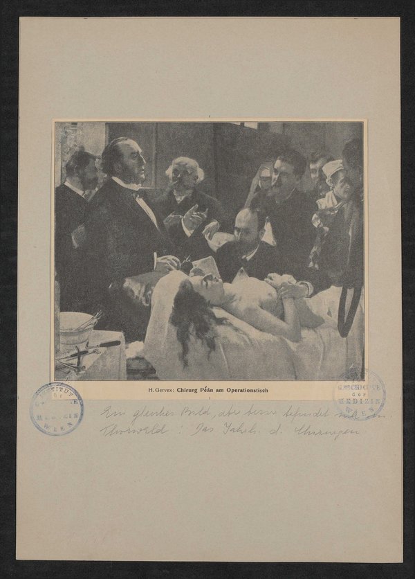 Die Vorlage wurde von Henri Gervex angefertigt. Auf der Vorderseite befinden sich zwei Stempel des Instituts für Geschichte der Medizin Wien.