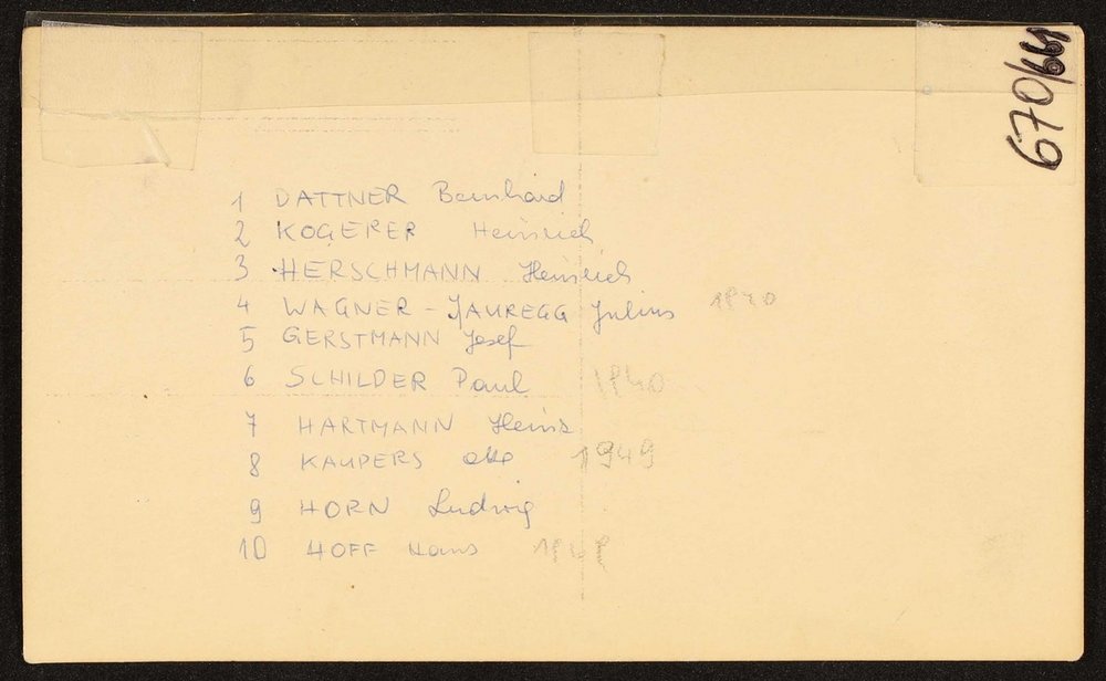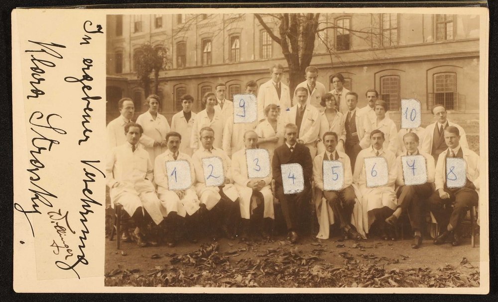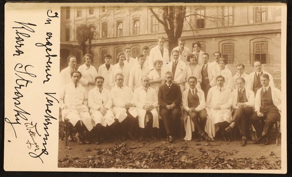 Fotografie: Wilhelm Willinger, Wien. Abgebildet: Klara Strasky (2. Reihe, 6. von Links), Julius Wagner-Jauregg (1. Reihe mittig), Hans Hoff (2. Reiche: 2. von rechts), Paul Schilder (1. Reihe: 3. von rechts), Josef Gerstmann (1. Reihe: 4. von rechts), Lydia Sicher.