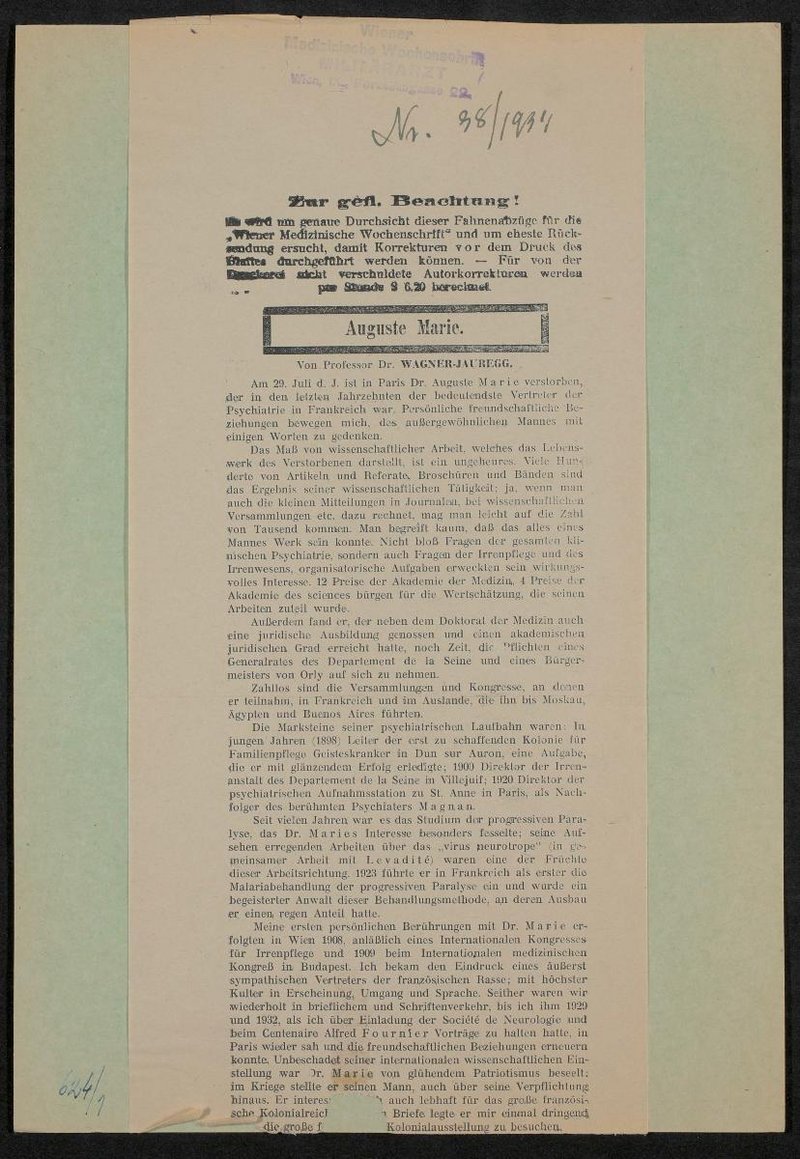 Der rückseitige Bericht ist in der Wiener Medizinischen Wochenschrift, Nr. 98, 1934, erschienen.