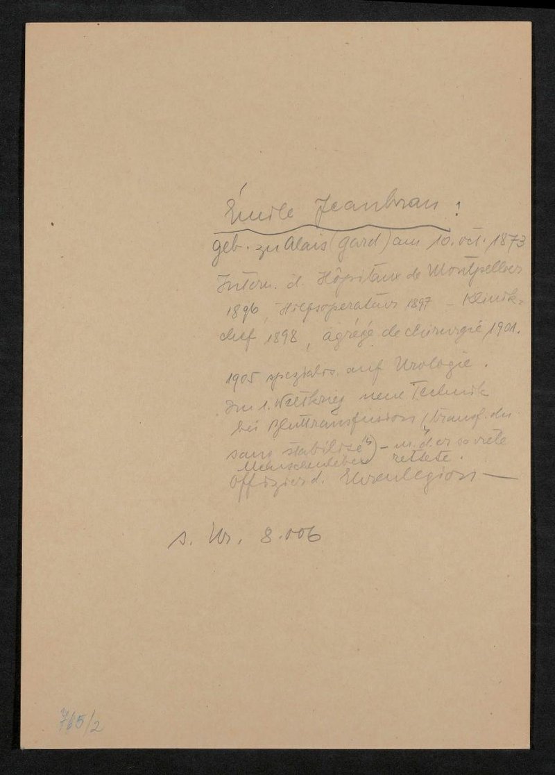 Die Vorlage wurde von Alphonse Chanteau angefertigt. Der Ausschnitt stammte vermutlich aus der französischsprachigen Zeitschrift Chanteclair. Revue artistique et littéraire. Rückseitig wahrscheinlich versehentlich mit lebensgeschichtlichen Angaben zu Emile Jeanbrau beschrieben.