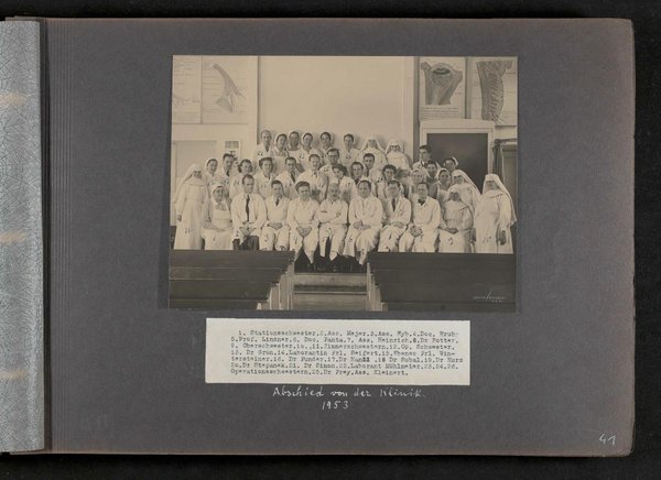 Fotografie: Photo Simonis. Abgebildet sind: 1. Stationsschwester, 2. Ass. Mejer, 3. Ass. Eyb, 4. Doc. Hruby, 5. Prof. Lindner, 6. Doc. Fanta, 7. Ass. Heinrich, 8. Dr. Rotter, 9. Oberschwester 10. Oberschwester, 11. Zimmerschwestern, 12. OP Schwester, 13. Dr. Grün, 14. Laborantin Frl. Seifert, 15. Laborantin Frl. Wintersteiner, 16. Dr. Funder, 17. Dr. Handl, 18. Dr. Subal, 19. Dr. Kurz, 20. Dr. Stepanek, 21. Dr. Simon, 22. Laborant Mühlmeier, 23. Oberschwester, 24. Oberschwester, 25. Dr. Frey Ass. Kleinert, 26. Oberschwester.