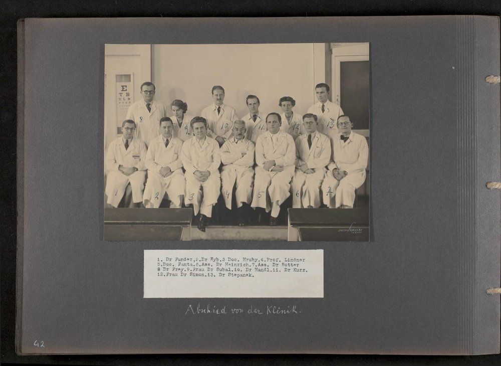 Fotografie: Photo Simonis. Abgebildet: 1. Dr. Funder, 2. Dr. Eyb, 3. Dr. Hruby, 4. Prof. Lindner, 5. Dr. Fanta, 6. Ass. Dr. Heinrich, 7. Ass. Dr. Rotter, 8. Dr. Frey, 9. Frau Dr. Subal, 10. Dr. Handl, 11. Dr. Kurz, 12. Frau Dr. Simon, 13. Dr. Stepanek.
