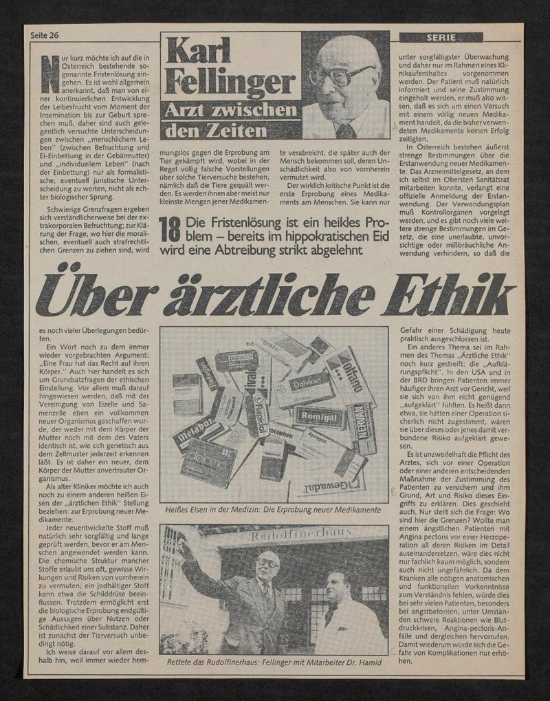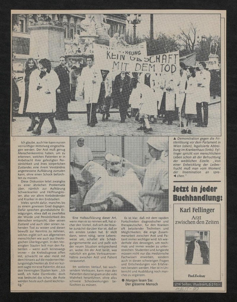 In der in der Neuen Kronenzeitung veröffentlichten Reportage sind folgende Abbildungen zu sehen: Bild A: Porträt von Karen Ann Quinlan; Bild B: verschiedene Medikamentenverpackungen; Bild C: Karl Fellinger mit Osama Hamid; Bild D: Demonstration gegen die Fristenlösung vor dem Parlament in Wien; Bild E: Ärzt:innen bei der Durchführung einer Abtreibung; Bild F: Buchcover der Autobiografie von Karl Fellinger. Arzt zwischen den Zeiten, verlegt von Rudolf Zsolnay.