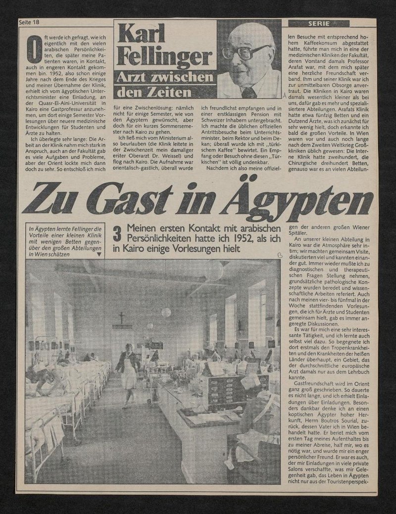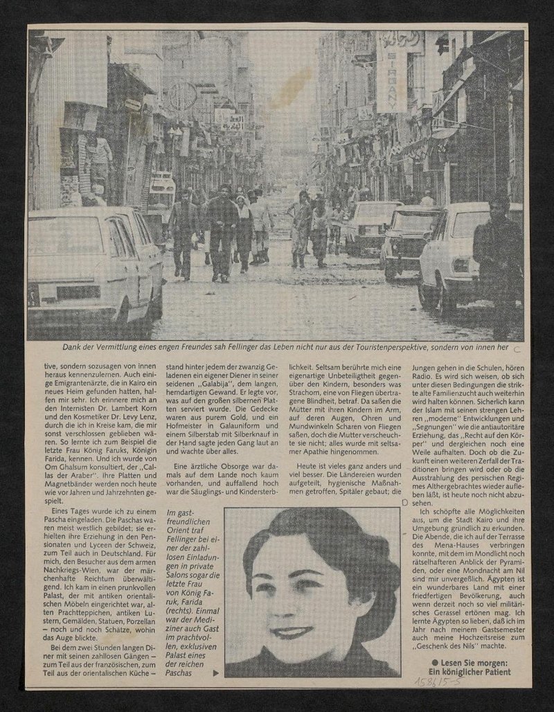 In der in der Neuen Kronenzeitung veröffentlichten Reportage sind folgende Abbildungen zu sehen: Bild A: Porträt von Karl Fellinger; Bild B: Aufnahme von Patientinnenbetten in einer unbekannten Klinik; Bild C: Ansicht einer Straße in Kairo; Bild D: Porträt von Farida von Ägypten.