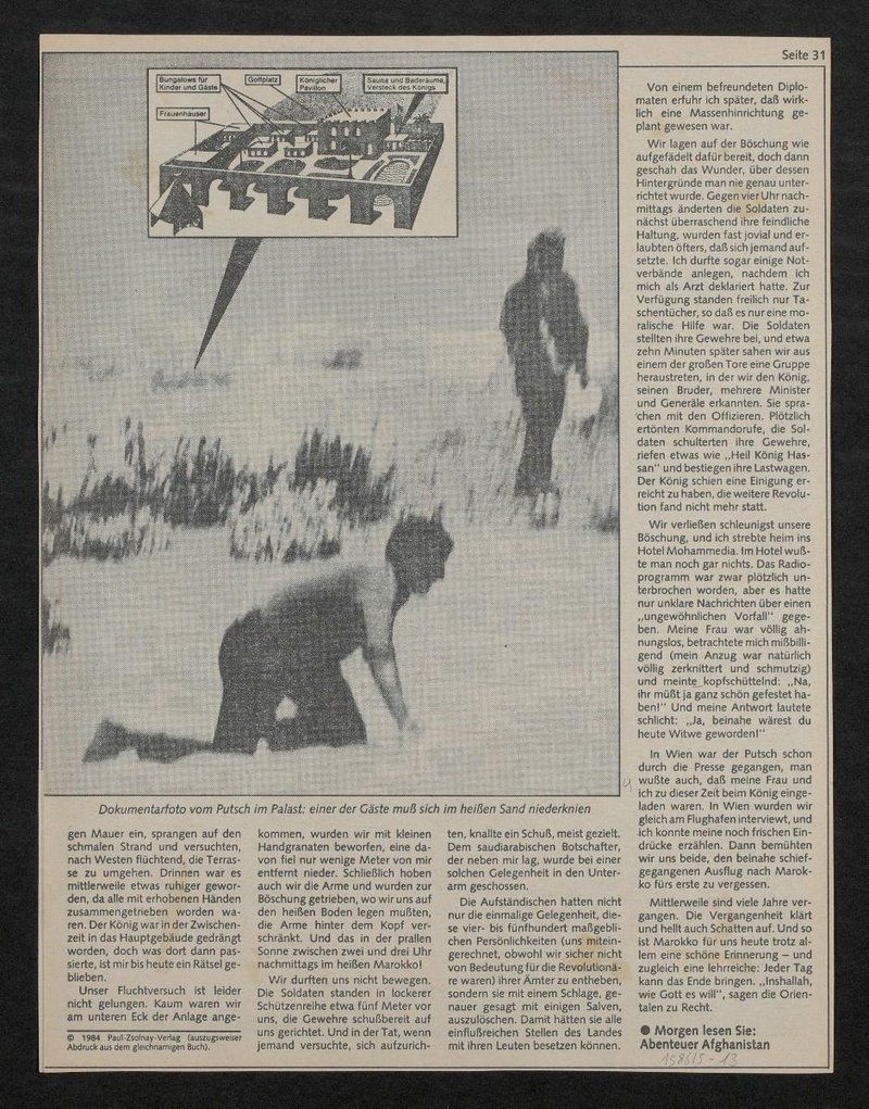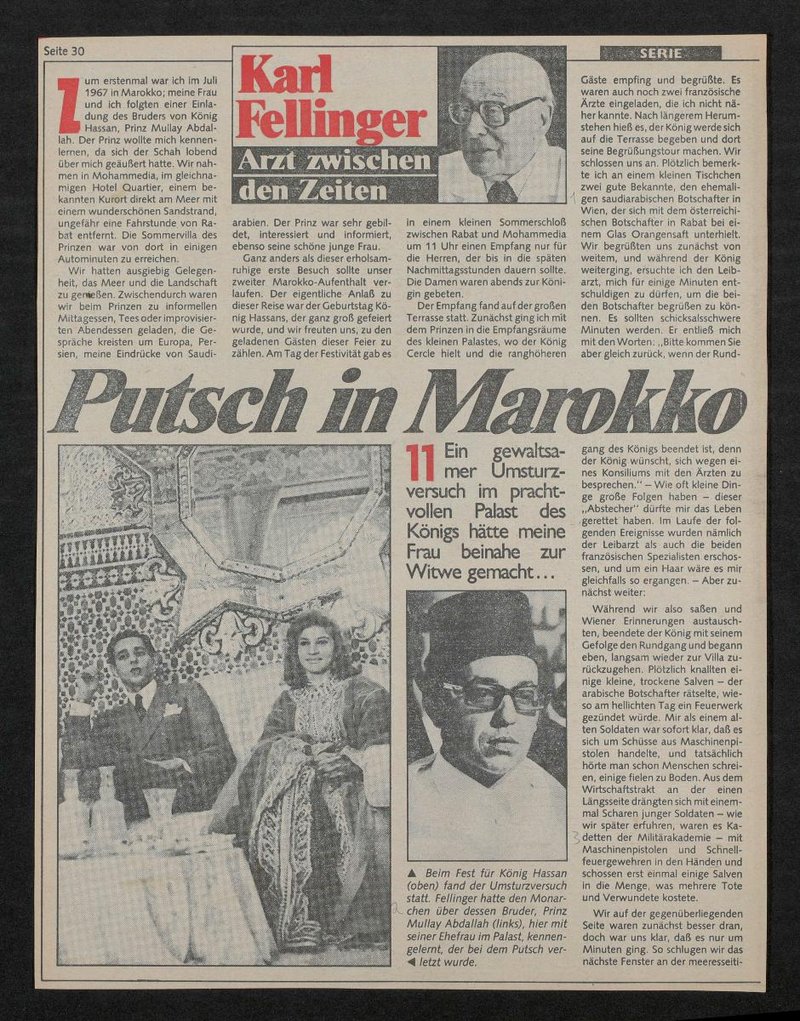 In der in der Neuen Kronenzeitung veröffentlichten Reportage sind folgende Abbildungen zu sehen: Bild A: Porträt von Karl Fellinger; Bild B: Moulay Abdallah von Marokko mit Lalla Lamia Al Solh; Bild C: Porträt von Hassan II. von Marokko; Bild D: Putschversuch von Skhirat mit einer schematischen Darstellung des Palastes.