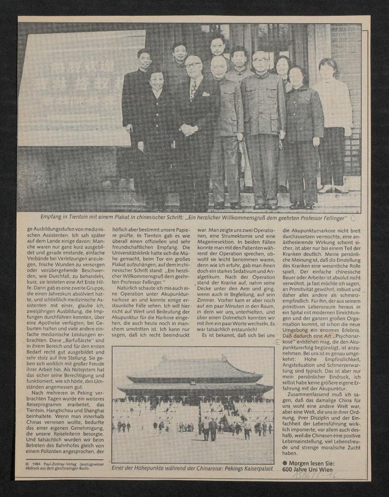 In der in der Neuen Kronenzeitung veröffentlichten Reportage sind folgende Abbildungen zu sehen: Bild A: Porträt von Karl Fellinger; Bild B: unbekannter Arzt und unbekannte Patientin bei der Akkupunktur; Bild C: unbekannter Arzt vor einer schematischen Darstellung zur Akkupunktur; Bild D: Karl Fellinger mit einer Delegation bei einem Empfang in Tientsin 1972; Bild E: Kaiserpalast in Peking.