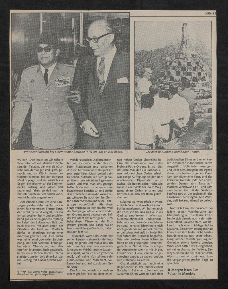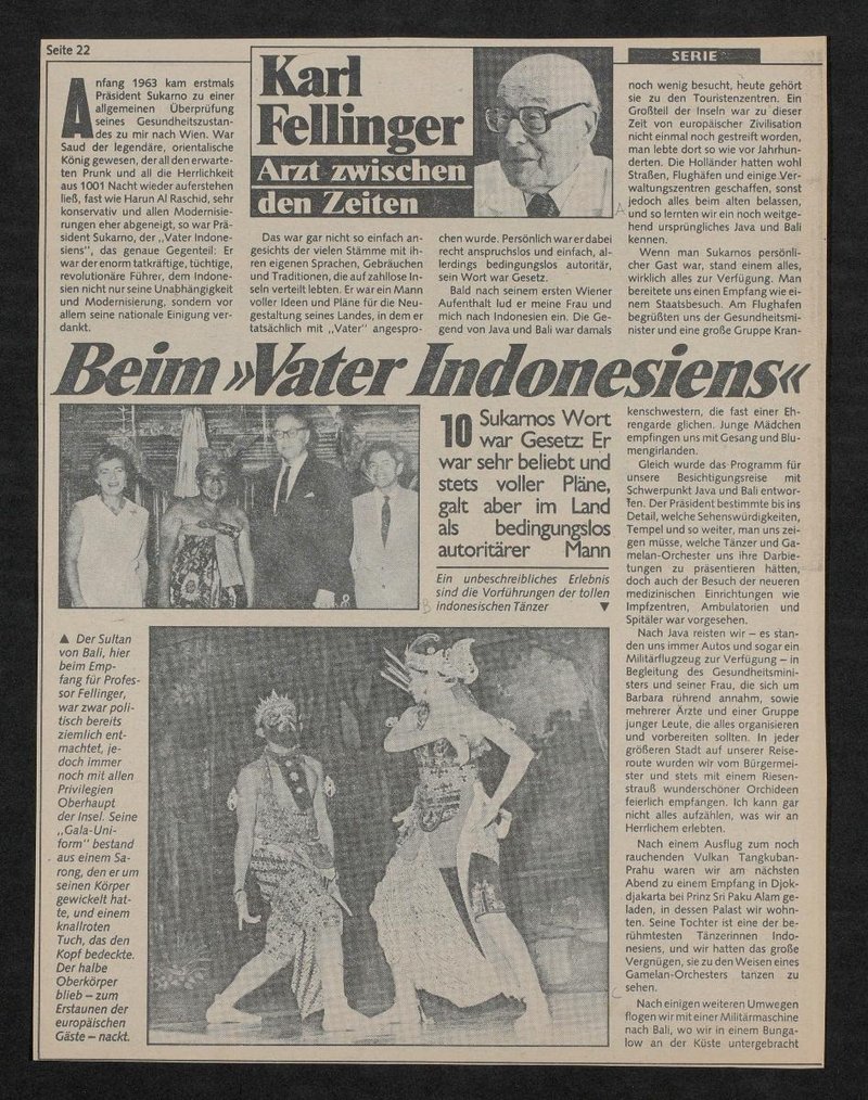 In der in der Neuen Kronenzeitung veröffentlichten Reportage sind folgende Abbildungen zu sehen: Bild A: Porträt von Karl Fellinger; Bild B: Karl Fellinger und Barbara Fellinger mit Sukarno im Jahr 1963; Bild C: Indonesische Tänzer:innen bei einer Aufführung; Bild D: Karl Fellinger mit Sukarno in Wien; Bild E: Karl Fellinger mit unbekannten Personen vor dem Borobudur Tempel.