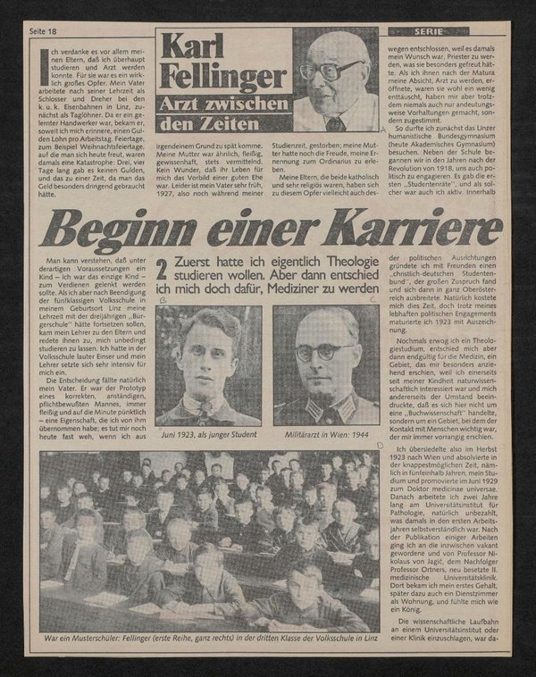 In der in der Neuen Kronenzeitung veröffentlichten Reportage sind folgende Abbildungen zu sehen: Bild A: Porträt von Karl Fellinger; Bild B: Porträt von Karl Fellinger von 1923; Bild C: Porträt von Karl Fellinger von 1944; Bild D: Karl Fellinger als Volksschüler mit seiner Schulklasse in Linz; Bild E: Karl Fellinger in einer Tracht im Jahr 1913 in Hallstadt.