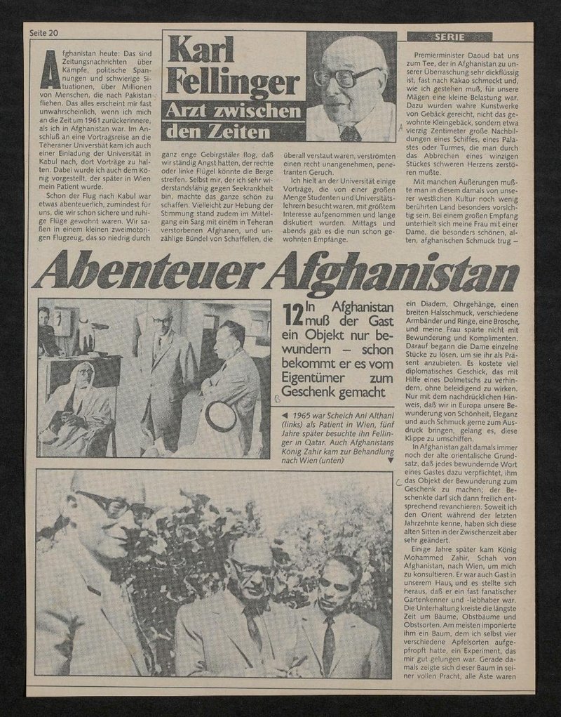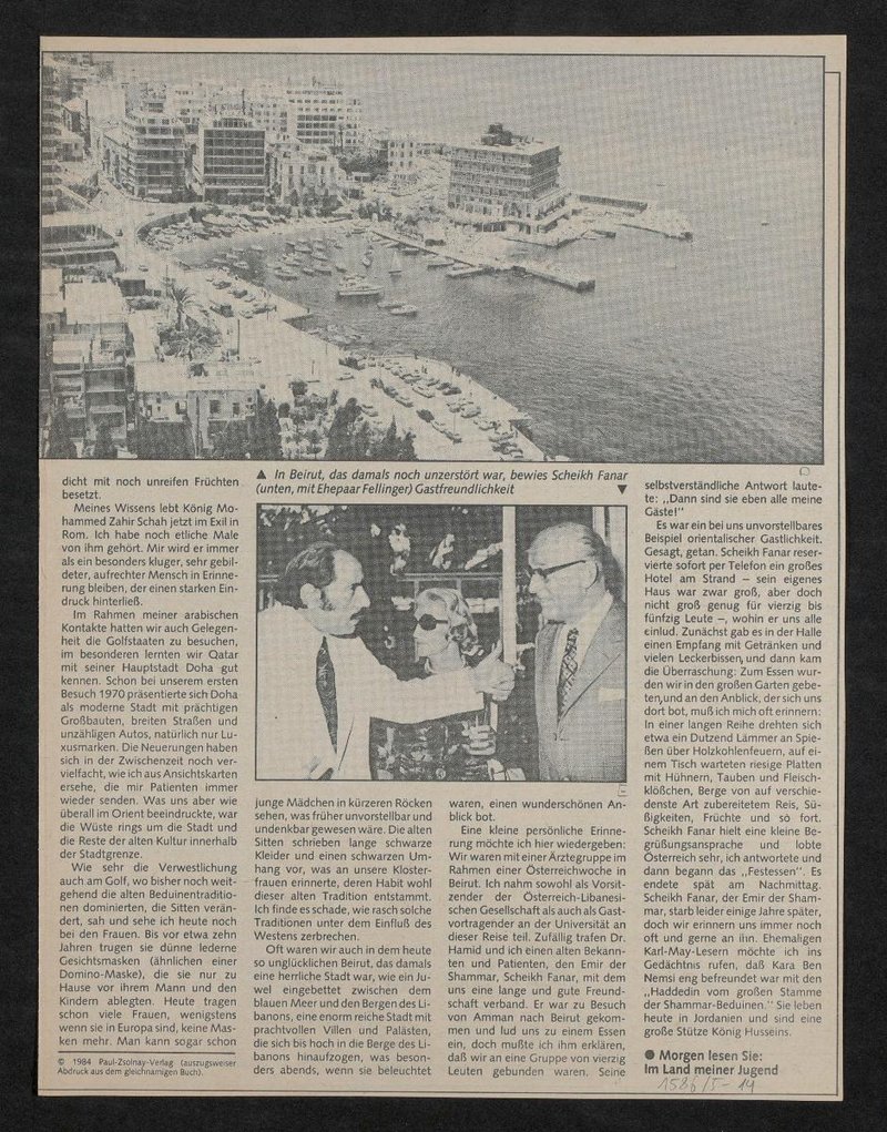 In der in der Neuen Kronenzeitung veröffentlichten Reportage sind folgende Abbildungen zu sehen: Bild A: Porträt von Karl Fellinger; Bild B: Karl Fellinger mit Ani Al Thani als Patient in Wien 1965; Bild C: Karl Fellinger mit Mohammed Zahir und einer unbekannten Person in Wien; Bild D: Luftansicht von Beirut vor dem Libanesischen Bürgerkrieg; Bild E: Barbara und Karl Fellinger mit dem Emir von Shammar, Sheikh Fanar in Beirut.