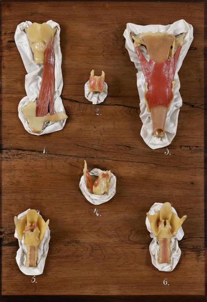1. Isoliertes Modell des Kehlkopfes mit beginnender Luftröhre sowie des oberen Teiles des Brustbeines (Manubrium sterni) mit einem Teil der linken ersten Rippe. Der linke Musculus sternothyreoideus ist dargestellt, wobei hierbei zu betonen ist, dass der Abstand zwischen Kehlkopf und Brustbein überdimensioniert ist und auch der Muskel selbst an der Rückseite – und nicht an der Vorderseite – von Brustbein und erster Rippe entspringt. 2. Isoliertes Modell von rechtem und linkem Stellknorpel (Cartilago arytaenoidea) und Ringknorpel (Cartilago cricoidea) von hinten. Man sieht den einzigen Öffner der Stimmritze, den Musculus cricoarytaenoideus posterior [Posticus]. 3. Isoliertes Modell des Rachens von dorsal. Man sieht die relevanten Anteile der Schädelbasis, die nach hinten ragenden großen Hörner des Zungenbeins (Os hypodeum) und die hinteren Anteile des Schildknorpels. Es sind Musculus constrictor pharyngis superior und Musculus stylopharyngeus dargestellt. Auf der rechten Seite befindet sich auch ein akzessorisches Muskelbündel. 4. Isoliertes Modell von Kehldeckel (Epiglottis), rechte Schildknorpelhälfte (Cartilago thyroidea), Ringknorpel (Cartilago cricoidea) und Stellknorpel (Cartilago arytaenoidea) von der linken Seite. Die Pars thyreoepiglottica des Musculus thyroarytaenoideus, der Musculus cricoarytaenoideus lateralis und der Musculus arytaenoideus transversus sind dargestellt. 5. Isoliertes Modell des Kehlkofes und beginnender Luftröhre von dorsal. Linker Musculus arytaenoideus obliquus und linker Musculus thyroarytaenoideus. 6. Isoliertes Modell des Kehlkopfes und beginnender Luftröhre von dorsal. Linker Musculus thyreoarytaenoideus und rechter Musculus cricoarytaenoideus lateralis.