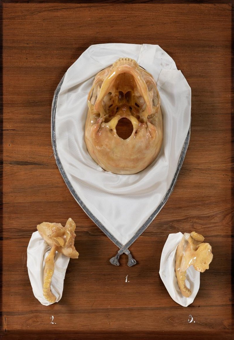 1. Die Kiefergelenke (Articulationes temporomandibulares) und ihr Bandapparat in einer Ansicht von kaudal auf die Schädelbasis: die Gelenkskapsel ist insbesondere durch seitliche Faserzüge (Ligamentum laterale) verstärkt. Zusätzlich gibt es spezifisch abgrenzbare Bänder, das Ligamentum stylomandibulare, dass den Griffelfortsatz (Processus styloideus) mit dem Unterkiefer (Mandibula) verbindet, und das Ligamentum Sphenomandibulare, dass das Keilbein (Os sphenoidale) mit dem Unterkiefer verbindet. 2. Isoliertes Modell aus einem Teil des Schläfenbeins (Os temporale) und einem Teil des Unterkieferknochens (Mandibula). Das eröffnete Kiefergelenk (Articulatio temporomandibularis) und dessen Gelenkscheibe (Discus articularis) in einer maximalen künstlichen Abduktionsstellung. 3. Isoliertes Modell aus einem Teil des Schläfenbeins (Os temporale) und einem Teil des Unterkieferknochens (Mandibula). Das Kiefergelenk (Articulatio temporomandibularis), eröffnet zur Darstellung der Gelenkscheibe (Discus articularis) in einer maximalen künstlichen Adduktionsstellung.