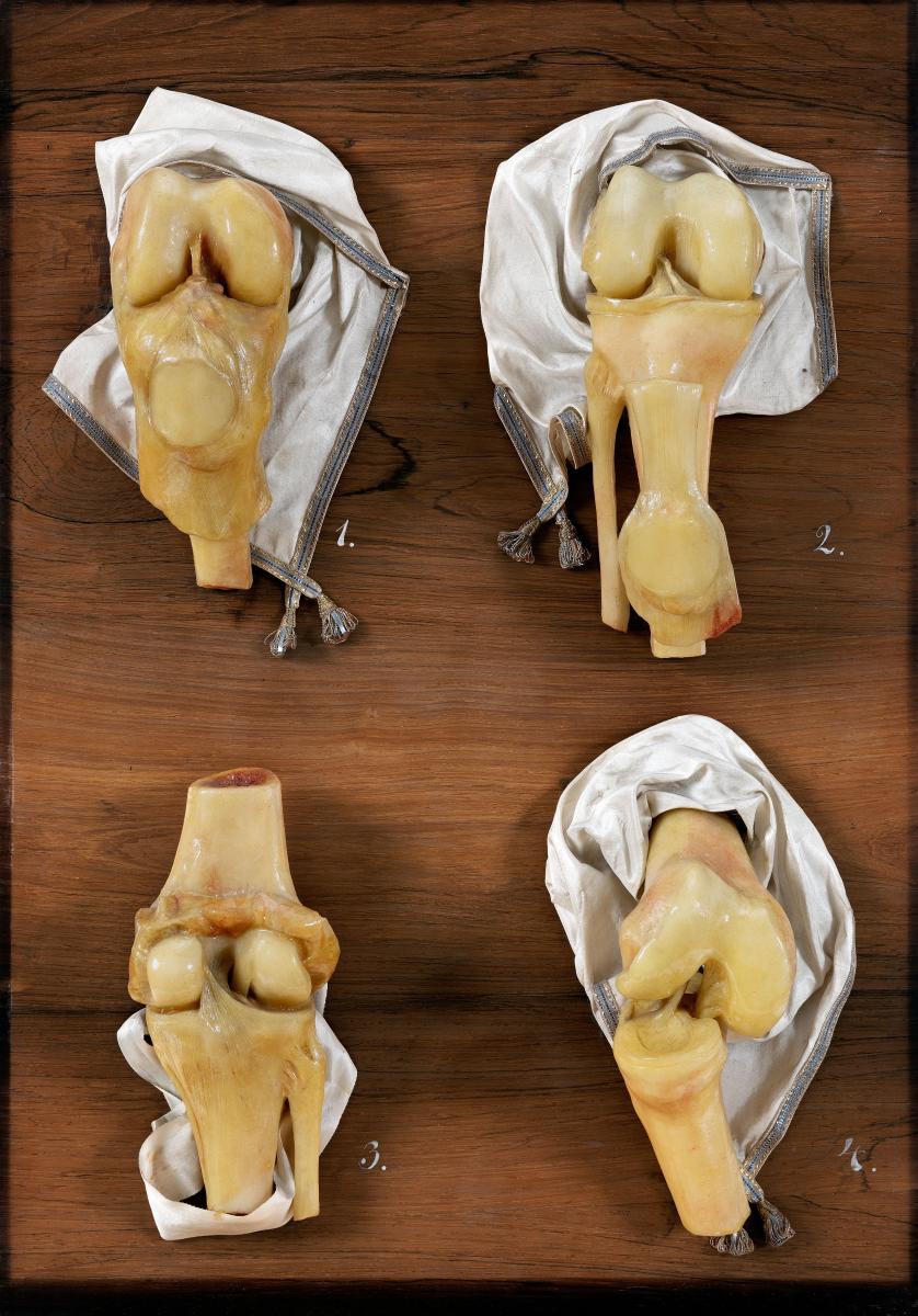 1. Rechtes gebeugtes Kniegelenk von vorne. Die Kapsel wurde eröffnet, die Kniescheibe (Patella) am Ligamentum patellae hängend mit der vorderen Kapsel nach unten geklappt. So kommen Synovialduplikaturen als Falten zur Ansicht: die Plica synovialis infrapatellaris, die zur Spitze des Hoffa’schen Fettkörpers zieht, sowie die beiden seitlichen Flügelfalten (Plicae alares). 2. Rechtes gebeugtes Kniegelenk von vorne. Die Kapsel wurde eröffnet, die Kniescheibe (Patella) am Ligamentum patellae hängend nach unten geklappt. Das Ligamentum patellae wurde begrenzt und die Schleimhautduplikaturen des Gelenkes sowie der Hoffa’sche Fettkörper wurden entfernt, sodass die mittig liegenden Kreuzbänder sowie die Vorderhörner der Menisken zur Ansicht kommen. 3. Rechtes gestrecktes Kniegelenk von hinten. Die Gelenkskapsel wurde eröffnet, sodass die Gelenksrollen des Oberschenkelknochens sichtbar sind. Mittig sieht man das hintere Kreuzband (Ligamentum cruciatum posterius) sowie eine Bandverbindung vom Außenmeniskus (Meniscus lateralis) zum Oberschenkelknochen, das Ligamentum meniscofemorale posterius Wrisberg, welches gemeinsam mit dem hinteren Kreuzband am Oberschenkelknochen befestigt ist. Ebenfalls dargestellt ist die Ansicht der Gelenksverbindung zwischen Schien- und Wadenbein, Articulatio tibiofibulare, von posterior. Die Kapsel des Gelenkes wird vom Ligamentum capitis fibulae posterius verstärkt. 4. Rechtes gebeugtes Kniegelenk von vorne. Die Seitenbänder des Kniegelenkes sind entfernt worden und das Schienbein (Tibia) nach außen rotiert worden. So wurde die Überkreuzung der beiden Kreuzbänder aufgehoben und sie sind beide in etwa parallel verlaufend sichtbar.