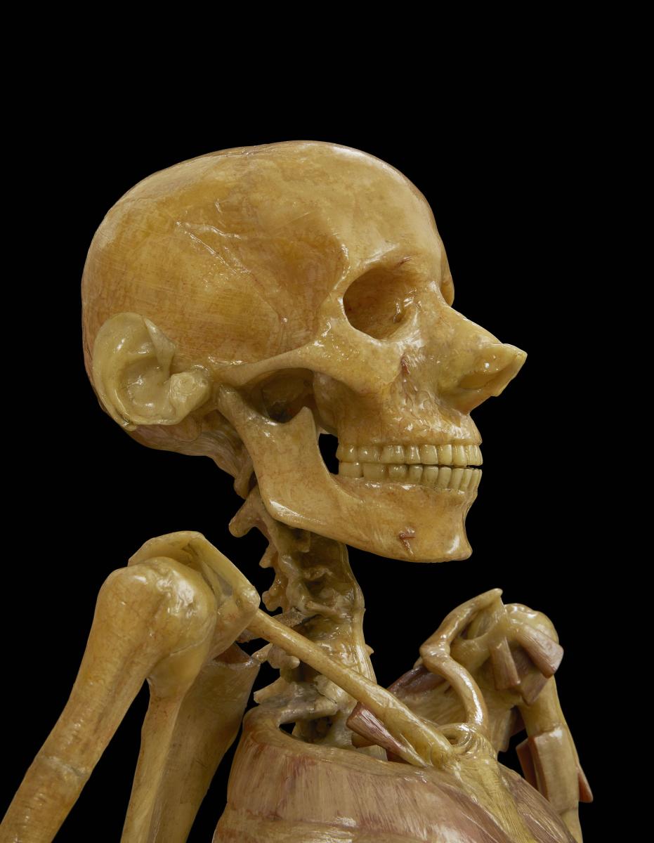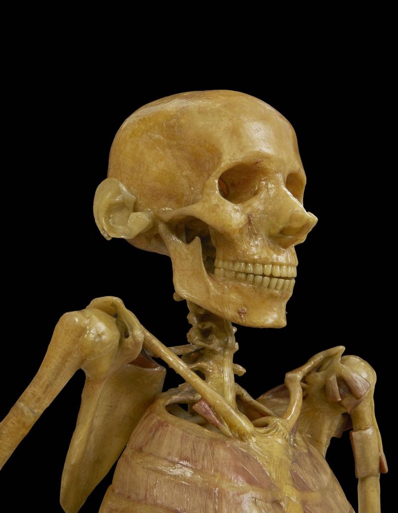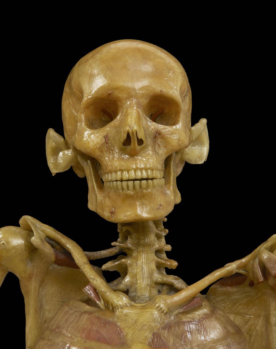 Die Gelenk- und Bandverbindungen der Knochen des menschlichen Körpers. Beim linken Schultergelenk ist die Rotatorenmanschette dargestellt, das rechte Hüft und das linke Kniegelenk sind eröffnet. Der linke untere Schambeinast ist verkrümmt, wodurch der Winkel zwischen den beiden unteren Schambeinästen vergrößert erscheint.
