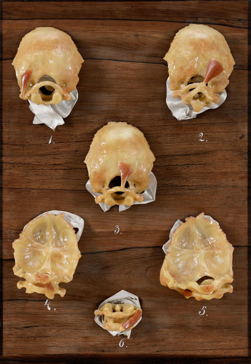 1. Isoliertes Hinterhauptbein (Os occipitale) und erster Halswirbel (Atlas) von dorsal. Linker Musculus obliquus capitis superior. 2. Isoliertes Hinterhauptbein (Os occipitale), erster Halswirbel (Atlas), und zweiter Halswirbel von dorsal. Rechter Musculus rectus capitis posterior major. 3. Isoliertes Hinterhauptbein (Os occipitale) und erster Halswirbel (Atlas) von dorsal. Rechter Musculus rectus capitis posterior minor. 4. Isoliertes Hinterhauptbein (Os occipitale) und erster Halswirbel (Atlas) von innen / ventral. Musculus rectus capitis anterior. 5. Isoliertes Hinterhauptbein (Os occipitale) und erster Halswirbel (Atlas) von innen / ventral. Musculus rectus capitis lateralis. 6. Isoliertes Modell der ersten beiden Halswirbel von dorsal. Musculus obliquus capitis inferior.