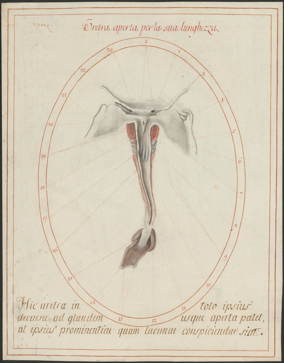 Längsschnitt durch die Harnröhre (Urethra masculina) bis zur Glans penis (Eichel) mit der Vorsteherdrüse (Prostata), einem Samenbläschen (Vesicula seminalis), den Samenleitern (Ductus deferentes und den Cowperschen Drüsen (Glandulae bulbourethrales).