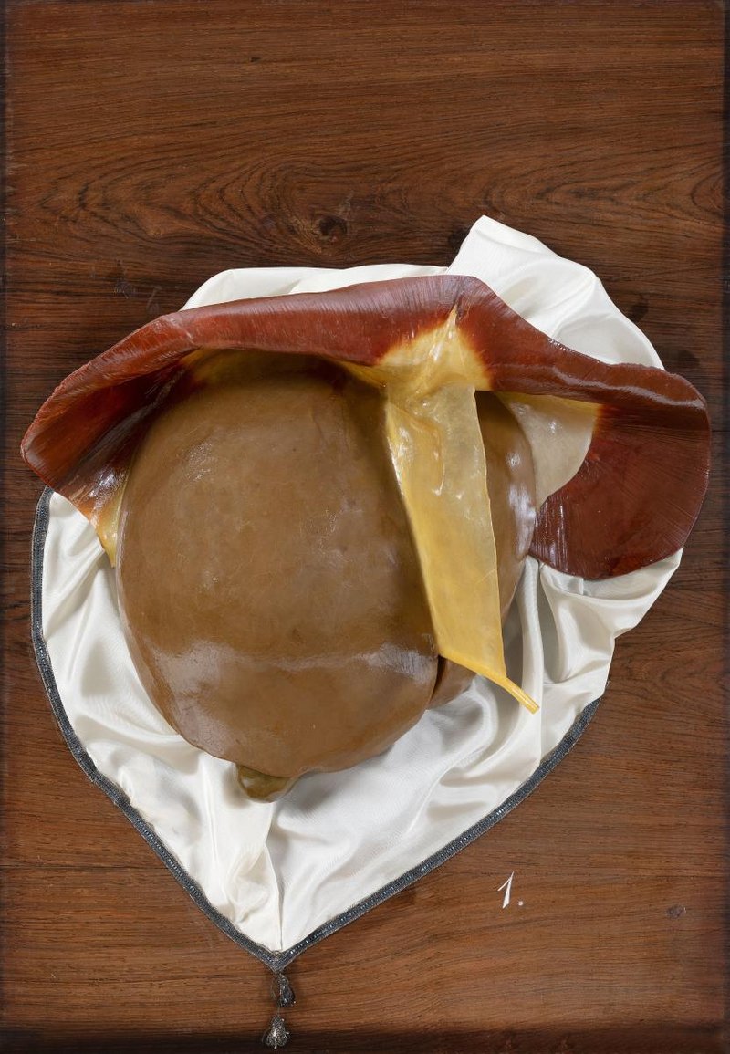 1. Ansicht der Leber von vorne-oben. Man sieht die Anheftungsstelle der Leber am Zwerchfell sowie das zwischen Ligamentum teres hepatis und Zwerchfell aufgespannte Ligamentum falciforme hepatis. Am freien Rand der Leber sieht man mit ihrem Fundus einen kleinen Teil der Gallenblase (Fundus vesicae felleae).