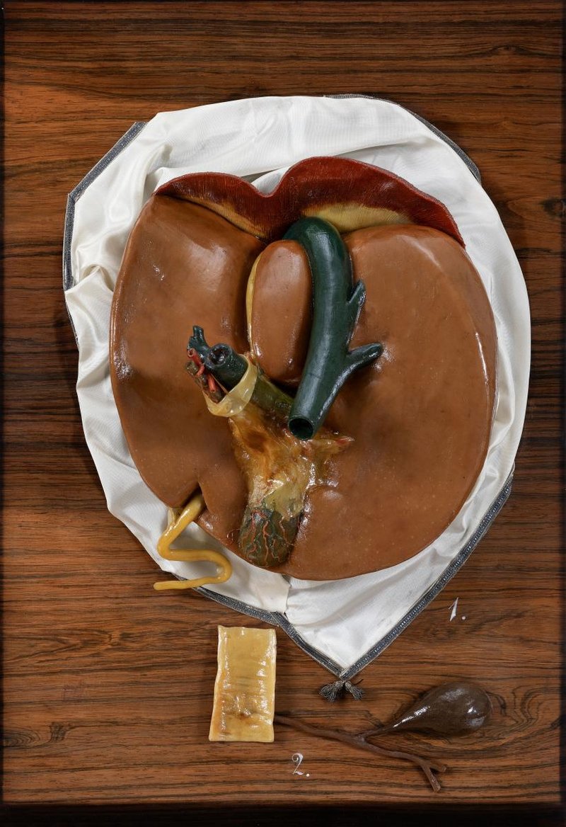 1. Unteransicht der Leber. An der Modelloberseite sieht man noch Reste des Zwerchfelles (Diaphragma) und direkt anschließend die untere Hohlvene. Der Hohlvene anliegend befindet sich an der linken Seite der Lobus caudatus der Leber. Direkt davor liegt die Gallenblase und an ihrer Seite links anliegend der Lobus quadratus der Leber. Ebenfalls dargestellt sind die Gefäße der Leberpforte – Vena portae hepatis, Arteria hepatica propria und Hauptgallengang (Ductus choledochus). Am freien Rand der Leber befindet sich das Ligamentum teres hepatis. Der nach der Geburt verödende, zwischen der Pfortader und der unteren Hohlvene verlaufende Abschnitt der Nabelvene (Ligamentum venosum [Arantii]) ist ebenfalls angedeutet. 2. Extrahepatische Gallenwege und ihre Einmündung in den entsprechend eröffneten Abschnitt des Zwölffingerdarmes (Duodenum). Die Gallenblase (Vesica fellea), der Gallenblasengang (Ductus cysticus), der Lebergang (Ductus hepaticus) und der Hauptgallengang (Ductus choledochus) und dessen Einmündung in den Zwölffingerdarm über die Papilla duodenalis major.
