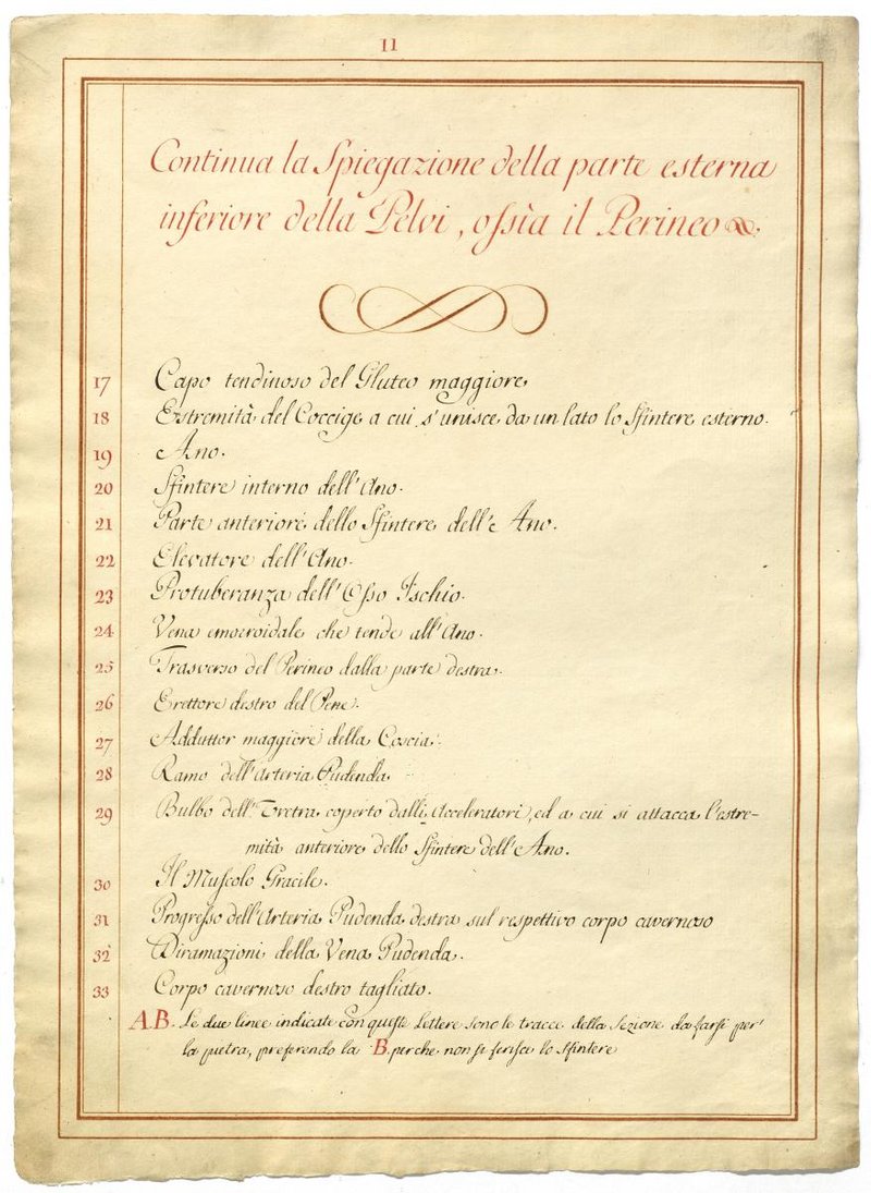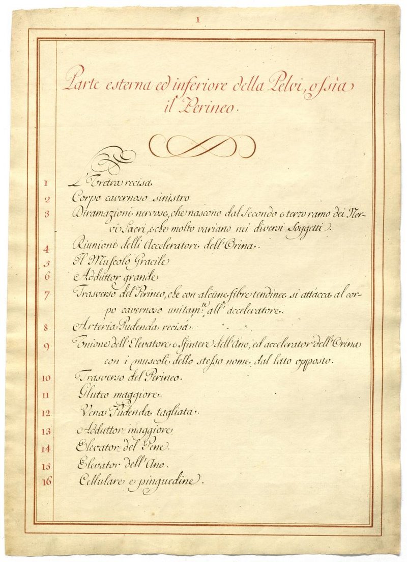 Der Text ist die ergänzende Beschreibung in italienischer Sprache zum anatomischen Wachsmodell der Leitungsbahnen der Dammgegend des Mannes.