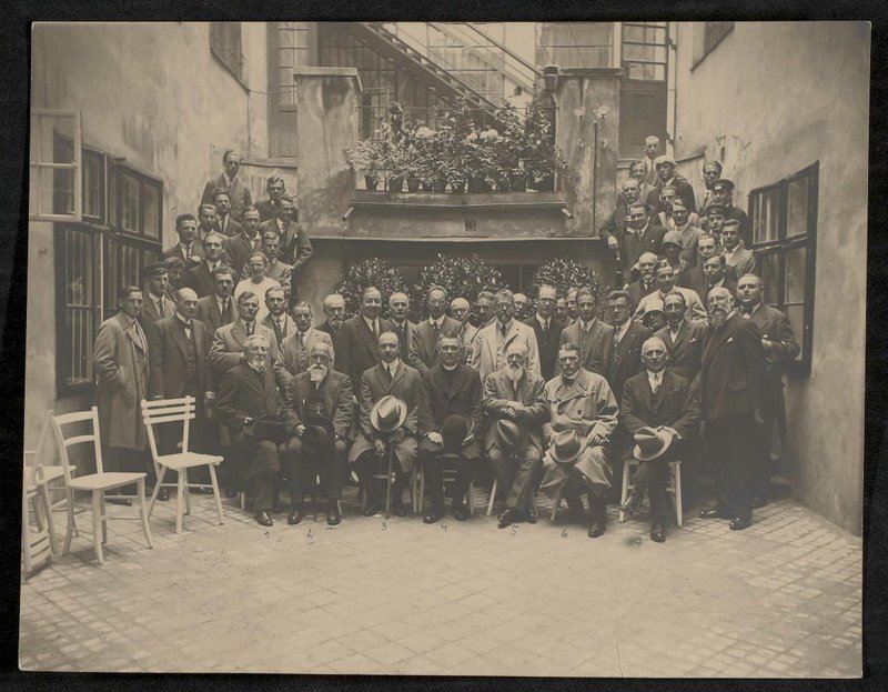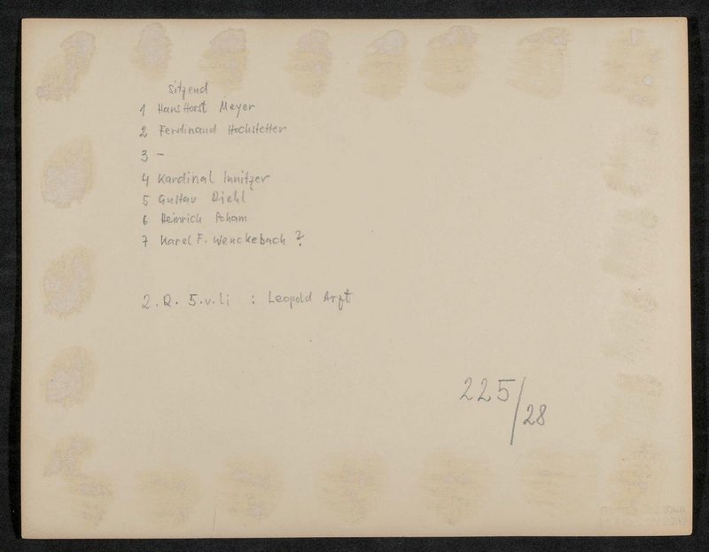 Fotografie: Max Schneider, Wien. Zu sehen sind: 1. Hans Horst Meyer, 2. Ferdinand Hochstetter, 3. Kardinal Innitzer, 4. Gustav Riehl, 5. Heinrich Peham; 2. Reihe 5. v. l. Leopold Arzt.